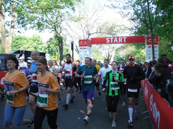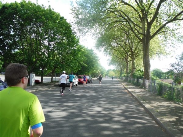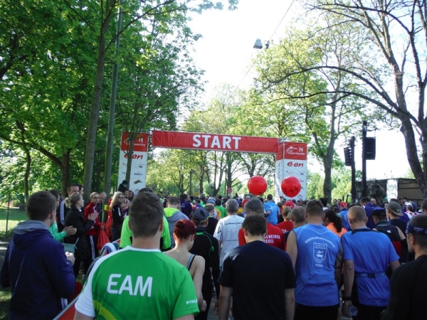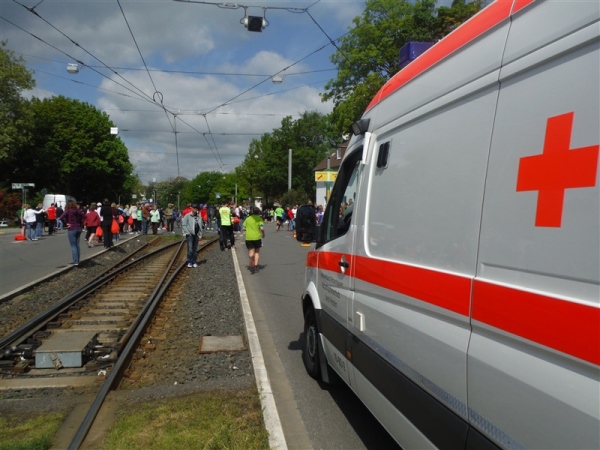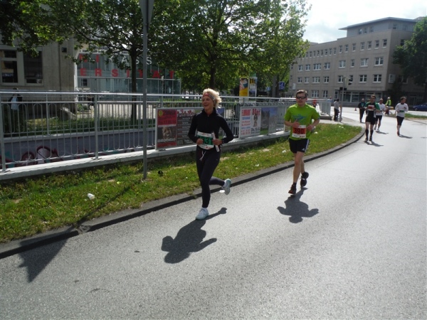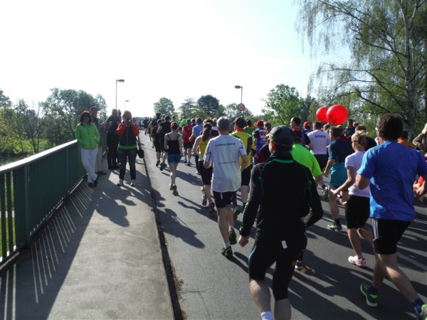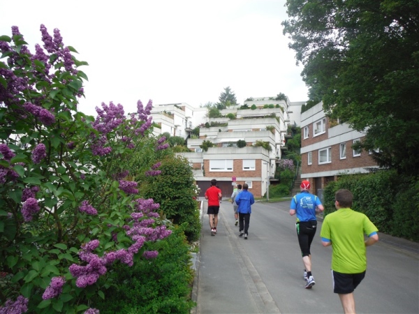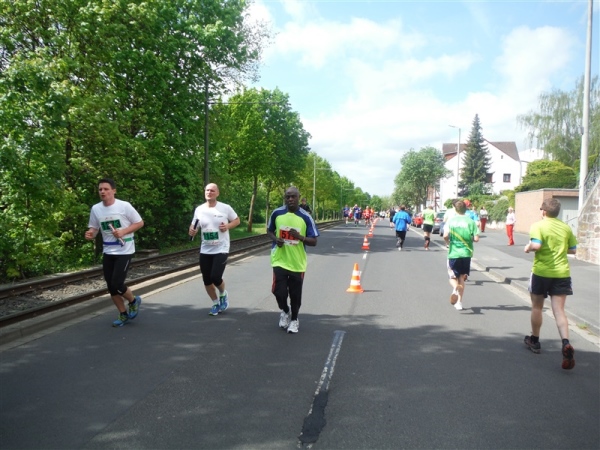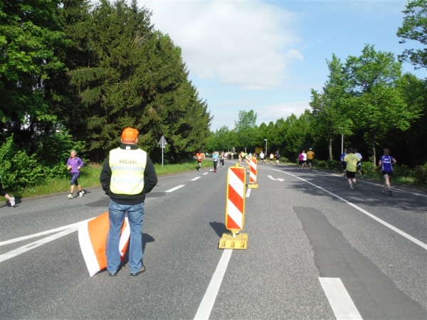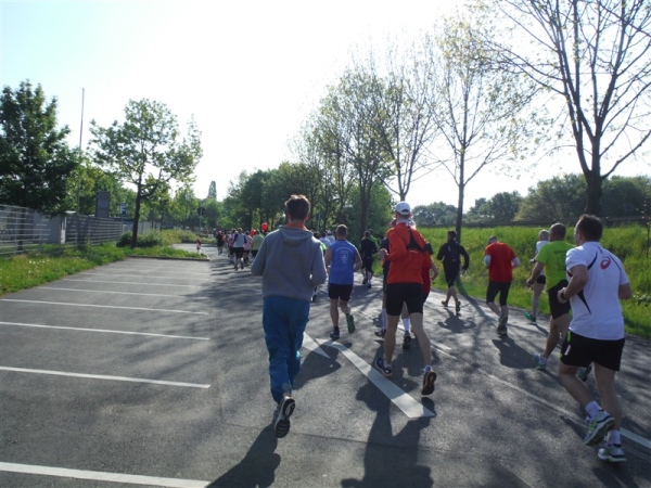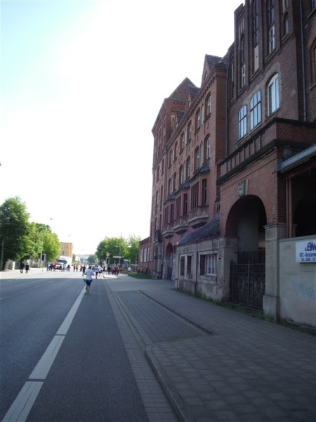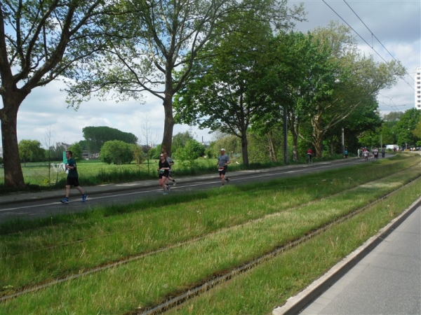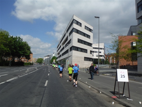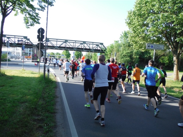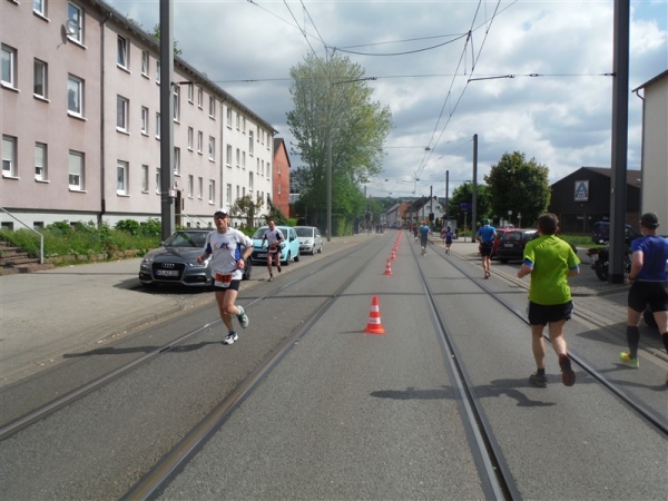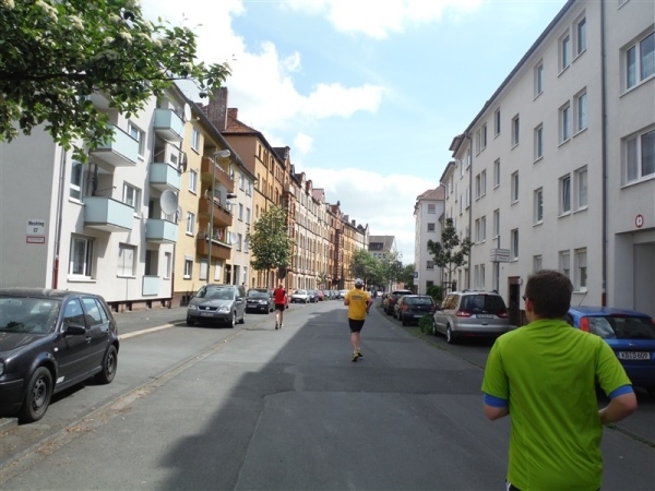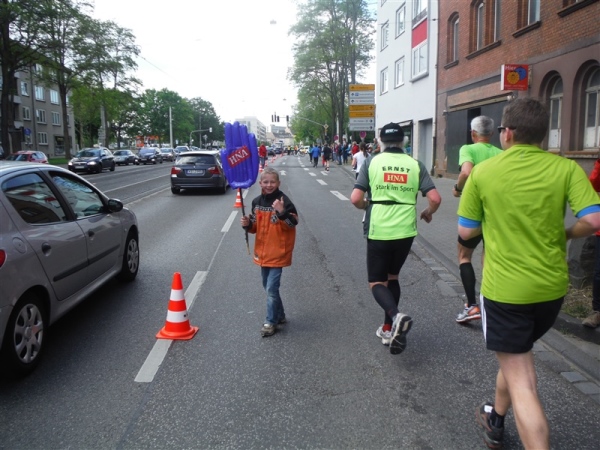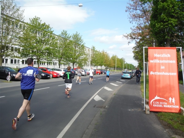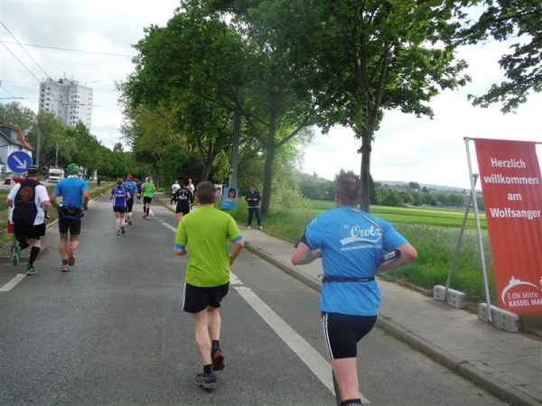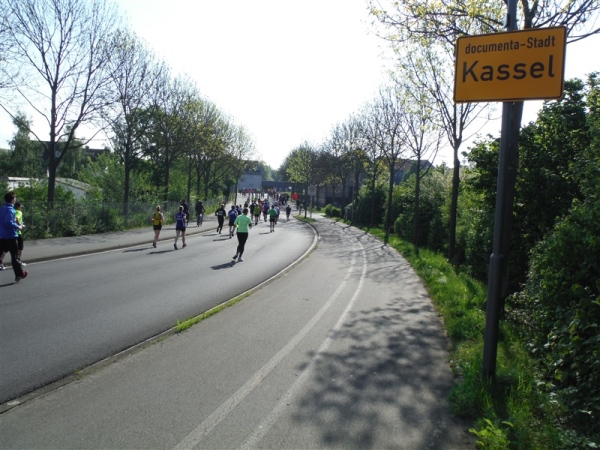 Nach einem knappen KM umrunden wir erst einmal das Kasseler Messegelände. Die Runde ist groß genug und das Feld noch zu dicht, so dass wir am Beginn noch keinen Spitzenläufer, am Ende aber auch keinen Nachzügler zu Gesicht bekommen. Hier laufe ich erstmal ein paar Meter mit Adalbert zusammen. Er kann mir ein paar Tipps geben, denn er ist hier bereits mehrfach gelaufen und kennt auch die Unterschiede zwischen der alten und neuen Streckenführung. Während man früher auf einem 4-Runden-Kurs mehrfach von seinen Fans bejubelt werden konnte, muss ich heute zugunsten einer erweiterten Stadtführung darauf verzichten. Ob das spannender wird, kann ich noch nicht abschätzen. Jedenfalls begrüßt uns bei KM 3 das erste Schild im Stadtteil Waldau. Architektonisch sind die folgenden KM noch nicht der Brüller. Dafür erwarten uns in diesem Wohnviertel die ersten größeren Zuschauergruppen um so herzlicher. Sie sind bereits warm gelaufen.