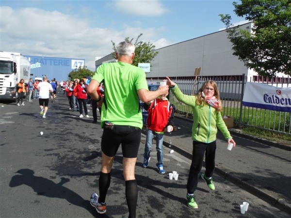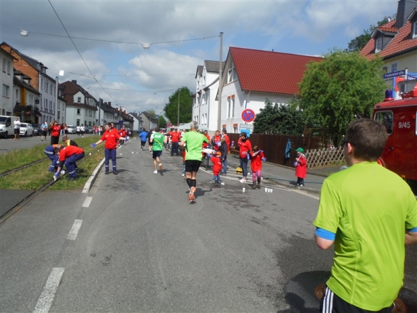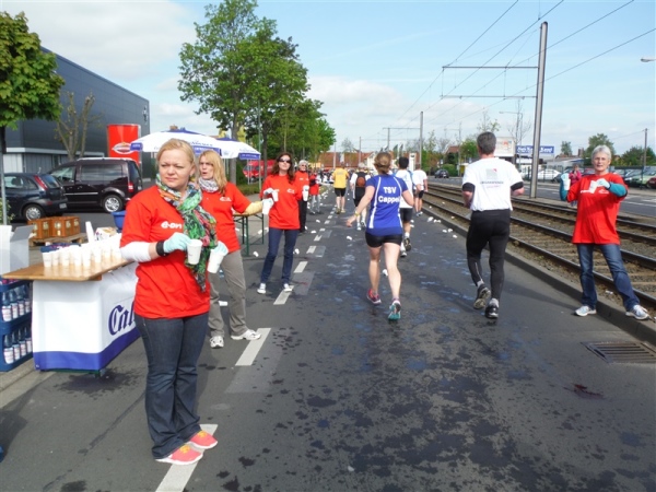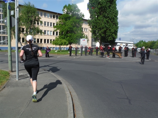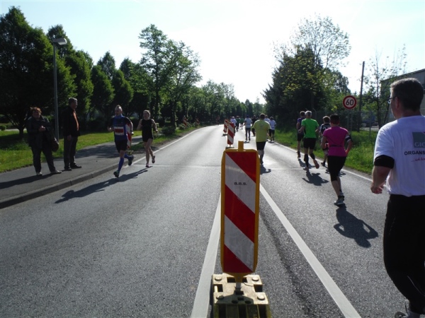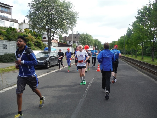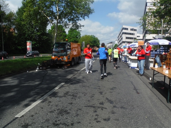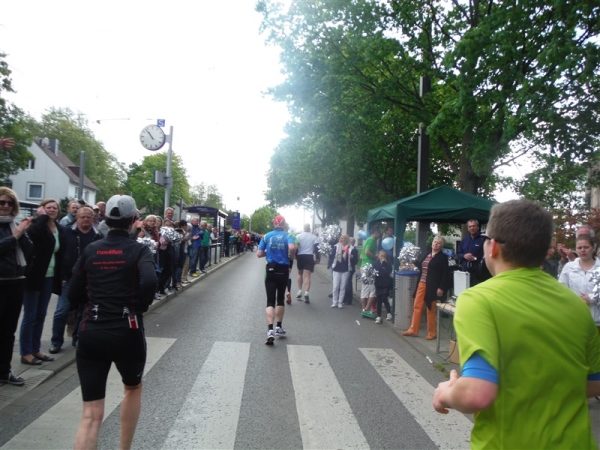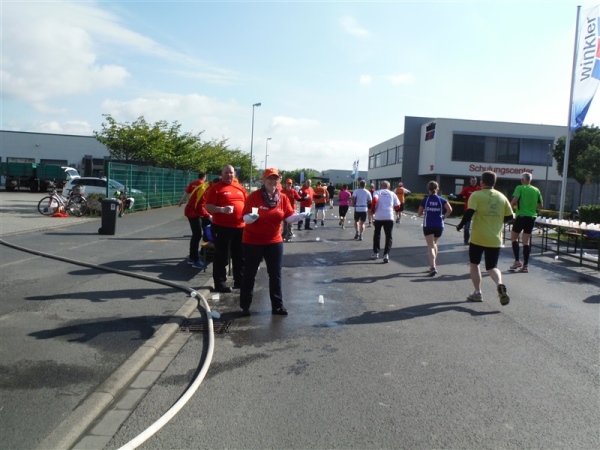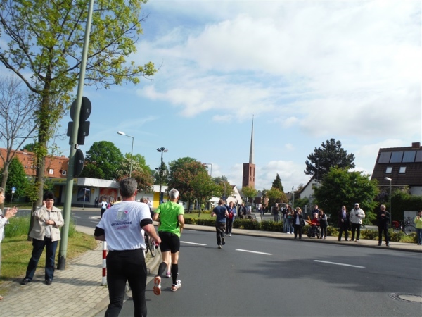 Eine lange Gerade führt uns fasst bis an die 10 KM-Marke heran. Ein Uhrenwagen zeigt knapp 55 Minuten an. Ein schöner Service, um sich zu orientieren. Mich klärt er darüber auf, dass mein heutiges Tempo noch stimmt. Kurz darauf wird es wieder deutlich lauter etwa bei KM 11 erreiche ich den ersten Wechselpunkt für die Staffelläufer. Da verwundert es nicht, dass ich auf den nächsten KM häufiger überholt werde. Mit den frischen Läufern will ich nicht konkurrieren und schon gar nicht mich mitreißen lassen. Lieber gleichmäßig Bettenhausen und Salzmannhausen durchlaufen, von den Zuschauern angespornt werden und bei alten Industrieanlagen kurz verweilen. Eindeutig, die Strecke wird abwechslungsreicher. Die Zuschauer gemütlicher - kurz vor KM 17 haben sie es sich schon in den Campingstühlen gemütlich gemacht. Sie müssen ja noch länger ausharren.