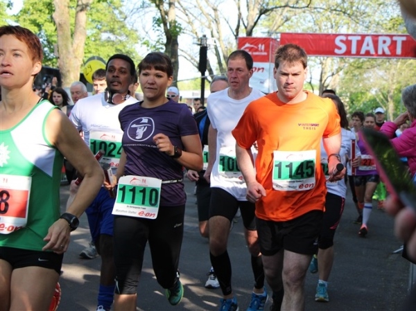Jetzt aber zum Start. Der Weg ist kürzer als gedacht. Der Startbereich in der Damaschkestraße ist trotz der kühlen Temperaturen bereits gut gefüllt. Die wenigen Plätze in der Sonne sind begehrt, da es sich hier gut aushalten lässt. Ich verabschiede mich schnell noch von meiner Familie, damit die sich weiter vorn platzieren kann. Die Nähe zu meiner Heimat zieht auch einige Bekannte an und so begrüße ich Adalbert und Wilhelm. Die übliche Bewertung des Wetters folgt. Wir sind uns, wie auch der Sprecher anmerkt, einig über die idealen Laufbedingen: Vor dem Lauf darf ruhig noch ein wenig gefröstelt werden. Doch nicht zu lange und schon hat das Warten ein Ende. Nach dem diesmal kurzen Countdown von 5 an werden wir pünktlich auf die Strecke gelassen. Die Straße ist am Start breit genug für das gesamte Feld aus Einzel- und Staffelläufern. So kommt es zu keinem größeren Gedränge. Ein gleichmäßiges Laufen ist möglich. Bereits nach wenigen Metern laufen wir in der Sonne. Der tiefblaue Himmel verspricht, dass es den ganzen Tag so bleiben wird.