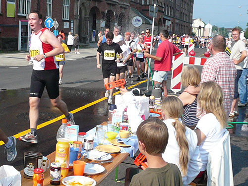 Bald war meine Familie da und brachte mir Kaffee, ein Service, den man haben kann, wenn man fast neben der Strecke wohnt. Ich halte ja neben klarem Wasser und Milch Kaffee, Cola und Bier, letzteres schön kalt, für ideale Laufgetränke. Ja, ich weiß, das ist undogmatisch, tut aber trotzdem verdammt gut in den richtigen Momenten.