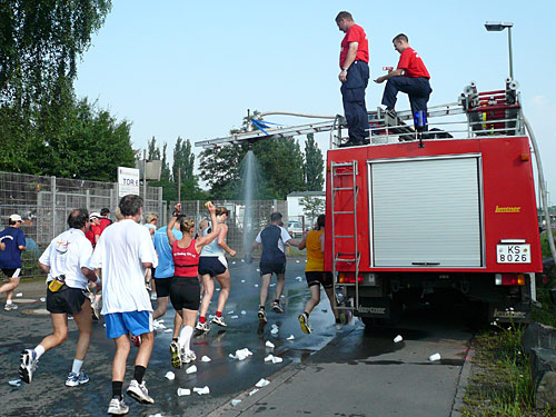 Und das ging immer weiter so, manchmal mehr, manchmal weniger Leute an der Strecke, alle gut aufgelegt. Musik gab es manchmal, sogar eine Hymne für den Kassel Marathon, Sambagruppen und Cheerleader machten ihre Show. Es gab sehr oft Wasser, sowohl in Bechern als auch von oben aus Duschen von Feuerwehrwagen.