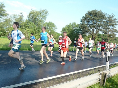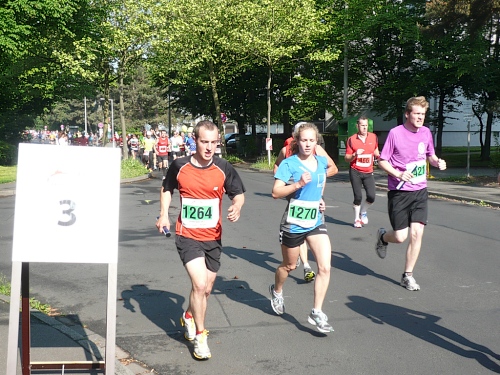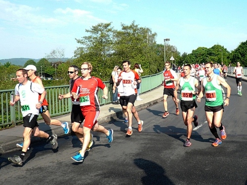Es erfolgt der Startschuss und ca. 500 Marathonis (rote Startnummern) und ca. 500 Staffelläufer (grüne Nummern) rennen los. Vorneweg wie immer die Elite mit einer Gruppe von Kenianern, die den Streckenrekord von 2:12:59 von Julius Muriuki jagen wollen. Die ersten rund 500m geht es über die Damaschkebrücke an den Rand der Buga-Seen. Für die Bundesgartenschau 1981 wurden hier nahe der Fulda eine große Seenlandschaft auf über 200 ha Fläche angelegt, die heute das Freizeitparadies der Kasseler ist.