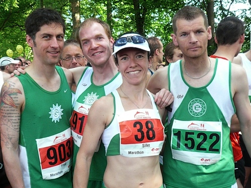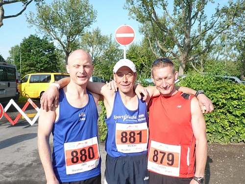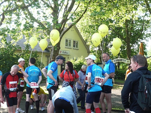 Kurz vor 9:00 Uhr sind hier jetzt nur noch die Marathonis und Staffelläufer versammelt. Die Stimmung ist hier wie jedes Jahr sehr gut. Es gibt heute wieder viele, die ihren ersten Marathon laufen. Für diese Marathoneinsteiger ist es von Vorteil, wenn es Zug- und Bremsläufer. Das schon eingespielte Team begleitet Läufer auf ihre Wunschzeiten, 2:59, 3:14, 3:29, 3:44, 3:59 und 4:29 Stunden. Der Zielschluss für die Marathonis ist heute um 14:30 Uhr nach 5 ½ Stunden. Auf der gesamten Laufstrecke ist jeder Kilometer markiert.