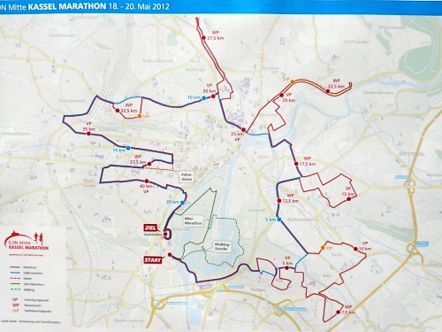 Der Marathon-Kurs durchläuft insgesamt 15 Stadtteile: Waldau, Forstfeld, Lohfelden (eigene Gemeinde), Bettenhausen, Wesertor, Wolfsanger, Fasanenhof, Nord (Holland), Philippinenhof-Warteberg, Rothenditmold, Kirchditmold, Vorderer Westen, Kassel-Mitte, Wehlheiden, Kassel-Süd, Unterneustadt.