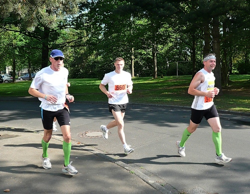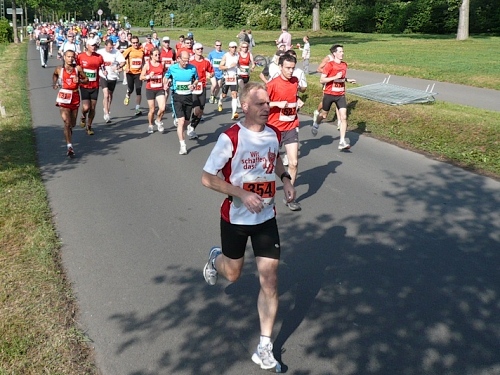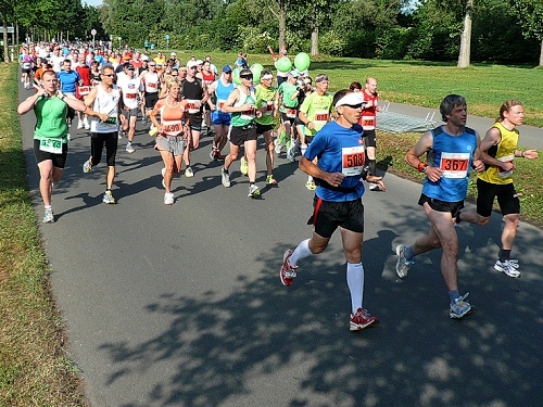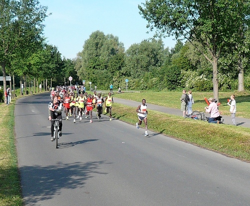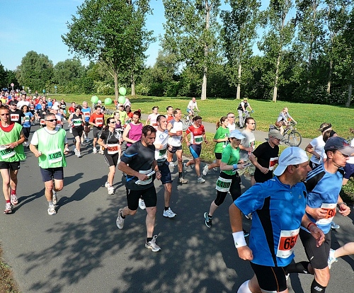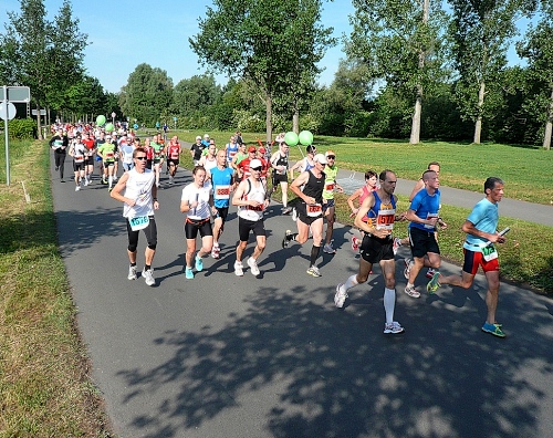 Ca. 800 Marathonis (rote Startnummern) und ca. 450 Staffelläufer (grüne Nummern) rennen los. Es geht parallel dem Bugasee entlang durch die Fuldaaue. Für die Bundesgartenschau 1981 wurden hier nahe der Fulda eine große Seenlandschaft auf über 200 ha Fläche angelegt, die heute das Freizeitparadies der Kasseler ist.