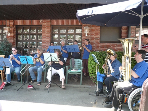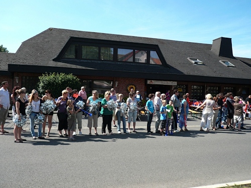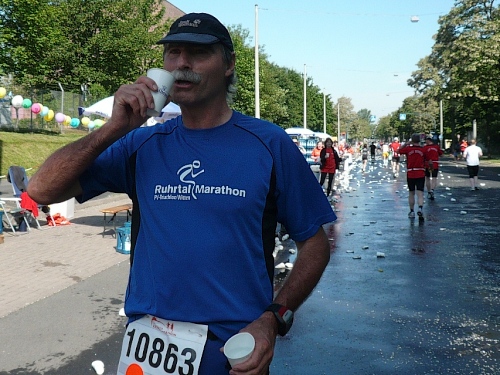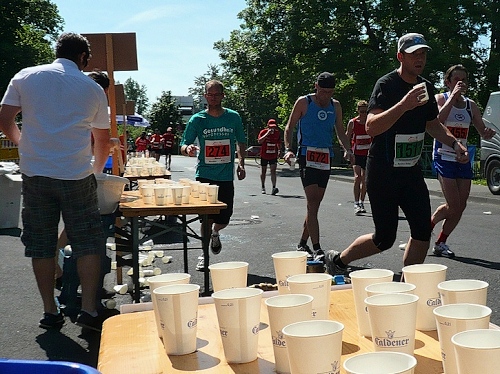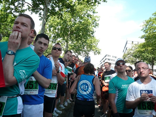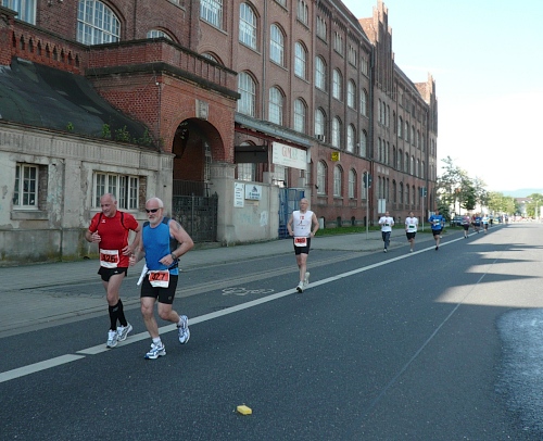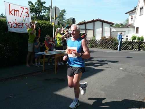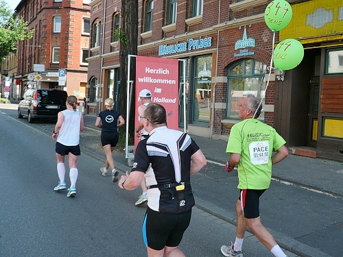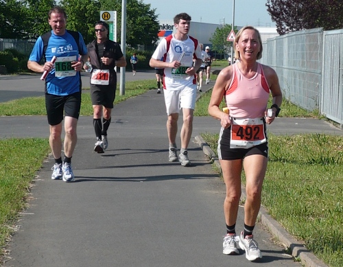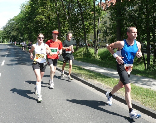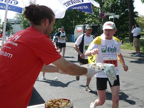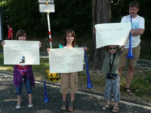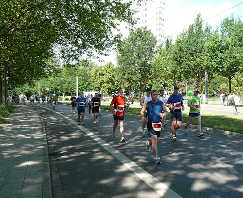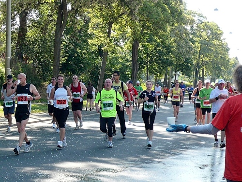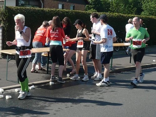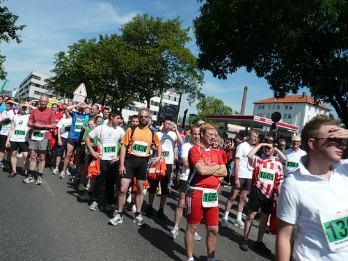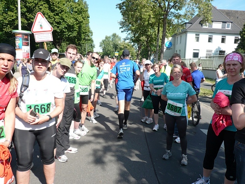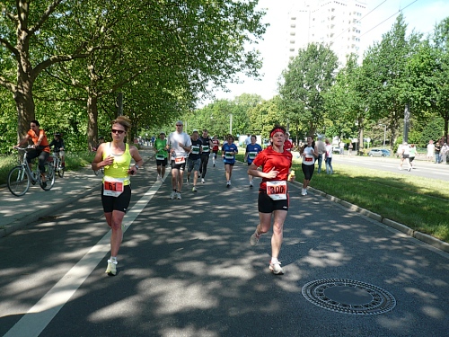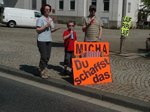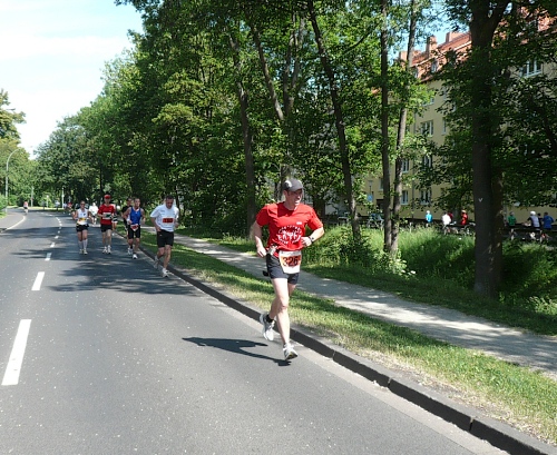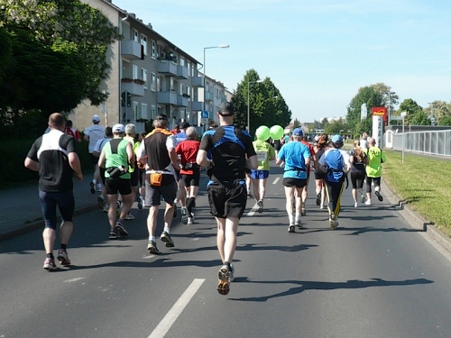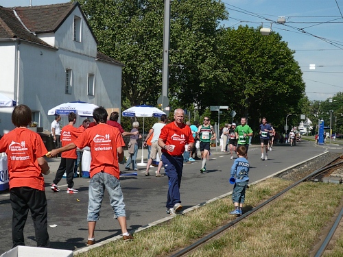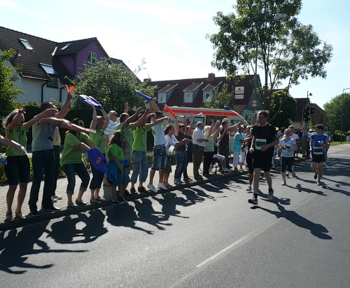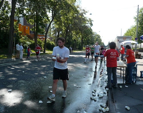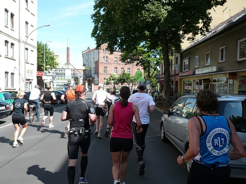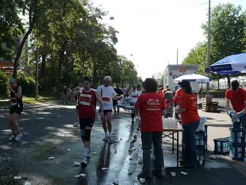 Jetzt kommen wir gleich wieder auf die alte Strecke, auf die Lilienthalstrasse. Hier am Beginn der Strasse steht unser LG und hat den ersten Ansturm der Halben schon hinter sich. So kann man die Marathonläufer besser empfangen, versorgen und freudig auf die restlichen ca. 31,5 km schicken.