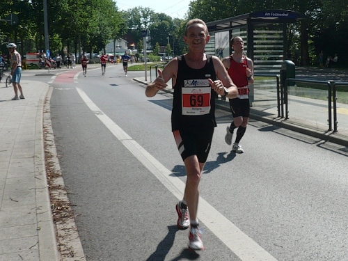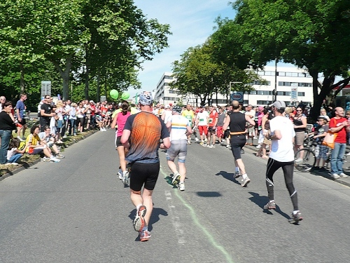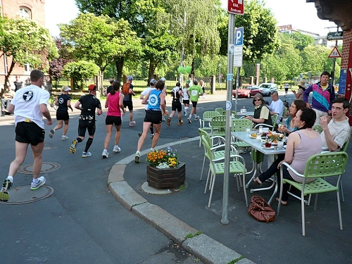 Noch vor Km 20 haben wir den freien Blick nach rechts zur Fulda, die jedoch nur für ortskundige sichtbar ist. Linker Straßenseite befindet sich eine der ältesten Terrassenwohnanlagen der Stadt mit Blick zum Naturschutzgebiet Fulda. Wir erreichen die Fulda am Wendepunkt bei ca. km 20,5. Vor einem bekannten Restaurant ist ein großes Fest mit toller Stimmung. Nach der HM-Zwischenzeit geht es auf der langen Wendepunktstrecke zurück Richtung Innenstadt zum Stadtteil Wesertor.