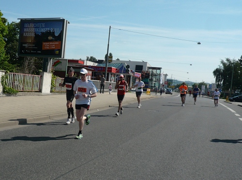 Wir durchqueren den Stadtteil und kommen auf die Leipziger Strasse. Sie ist die größte Einfahrtstrasse nach Kassel vom Osten her. Linker Hand grüßen uns die Roten aus Maranello, wo jedes Jahr ein Marathon stattfindet (9.Okt.2011 Maratona d'Italia Memorial Enzo Ferrari). Kurz danach erreichen wir hinter der Ochshäuser Str. den 10 km Punkt.