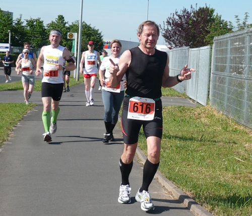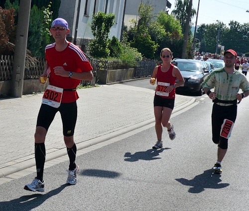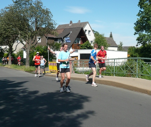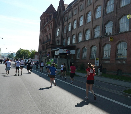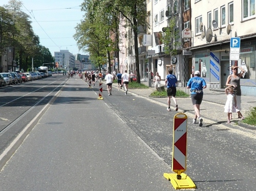 In Höhe der Seglergaststätte kommt der erste Anstieg über eine Brücke nach Waldau. Dieser erste Stadtteil hat so gar nichts Städtisches an sich, die schmucken Fachwerkhäuser vermitteln eher einen ländlichen Eindruck. Waldau wurde erst 1936 zu Kassel eingemeindet und ist einer der vier rechtsseitigen Stadtteile der Fulda, die Kassel in Süd-Nord-Richtung durchläuft. Es geht erst durch den alten und dann auch den neueren Teil von Waldau. Verschlafen ist Waldau heute Morgen nicht. Es sind viele Zuschauer am Straßenrand die Lärm machen und die Läuferschar anfeuern. In den Wohnsiedlungen stehen vor vielen Häusern die Anwohner und applaudieren den Läufern zu.