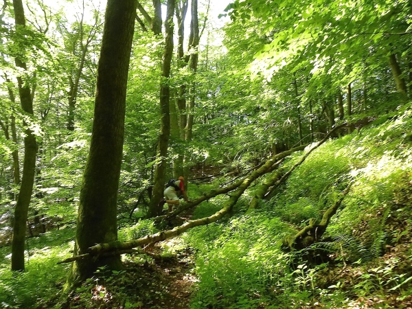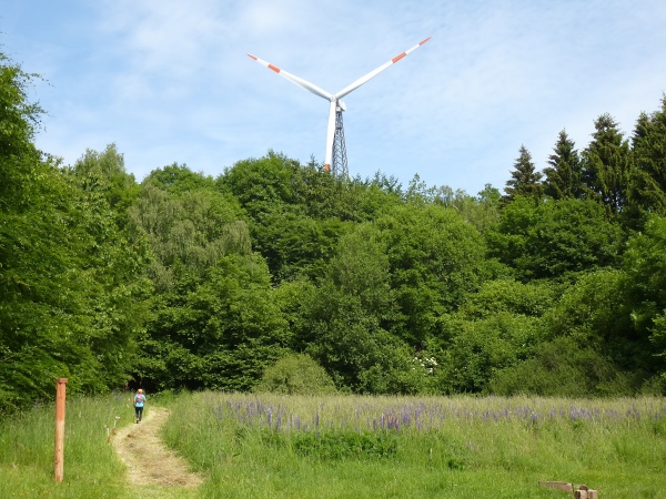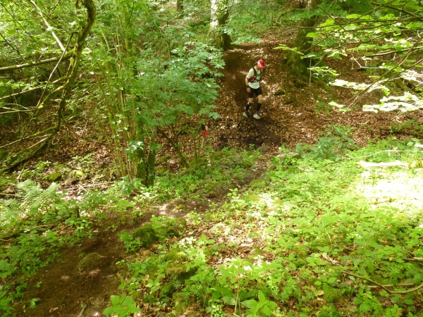 Damit niemand auf der stark verschlungenen Strecke abkürzt, gibt es ab und zu Kontrollstellen. Die zweite ist unmittelbar hinter der 1934-36 gebauten, 27 m hohen Eisernen Brücke. Von oben sehen wir uns andere Teilnehmer weit unter der Brücke hindurch laufen.