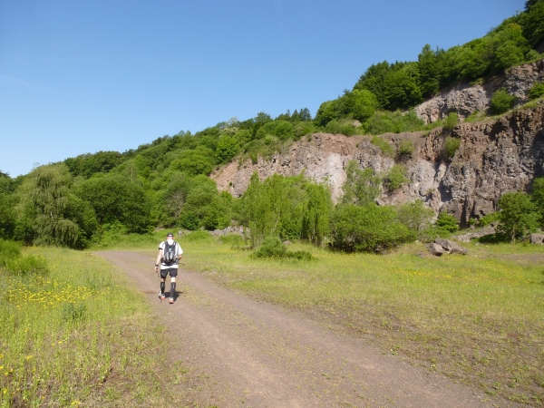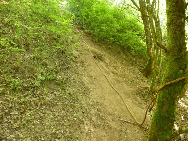 Nun kommt der einzigartigste Streckenabschnitt des K-UT. An manchen Stellen des Aufstiegs zum nächsten Steinbruch ist der Hang so steil, dass wir uns nur mit Hilfe von Seilen hinauf ziehen können. Mir gefällt das normalerweise sehr gut, doch heute fehlt mir die Kraft. Dennoch hangle ich mich mit einer Hand hoch und halte mit der anderen die Kamera, mit der ich diese Aufstiege filme.