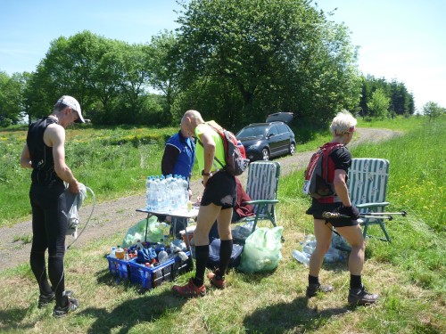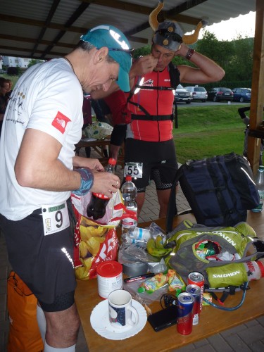 Das Anstehen an der einzigen Sanitäranlage zählt nicht zu den Kriterien der Vergabe zweier UTMB-Qualipunkte, aber die Verpflegungsautonomie. Lediglich Wasser wird an 4 VP´s bereitgestellt, man darf dort auch eigene Getränke hin transportieren lassen. Streng wird kontrolliert, dass keine feste Nahrung an die Flaschen geklebt wird. Die muss jeder ab dem Start selbst transportieren.