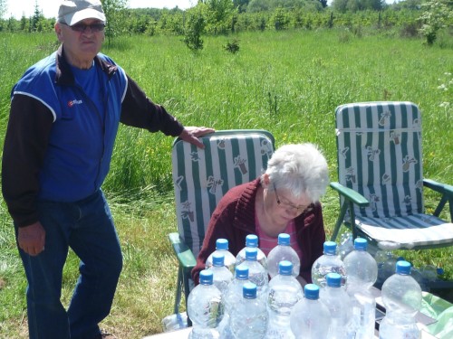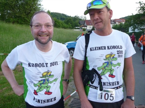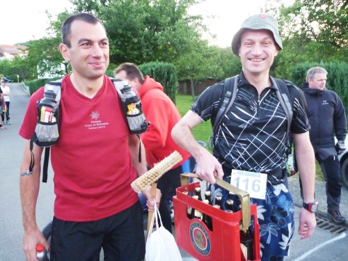 Christoph und Georg sind die Besenwagen, erkennbar am Schrubber und dem Kasten Bier. Die Utensilien kamen verständlicherweise nicht im Ziel an, obwohl Gehhilfen zwar zugelassen sind, aber offiziell auch ins Ziel gebracht werden müssen. Auch Babyjogger sind zugelassen, doch wer hier läuft, der kann Babies erstmal vergessen.