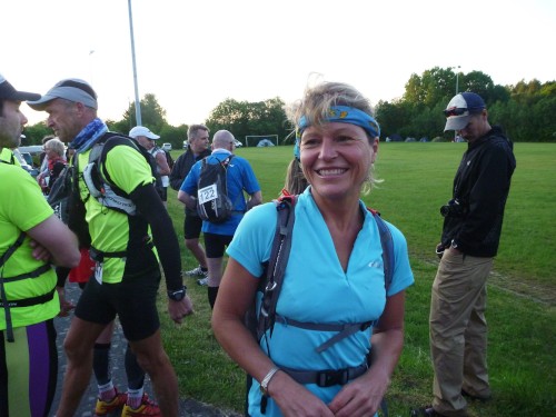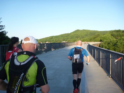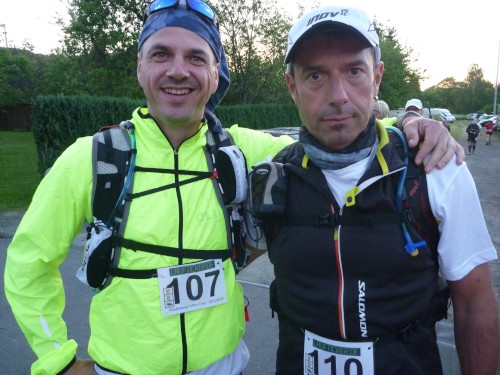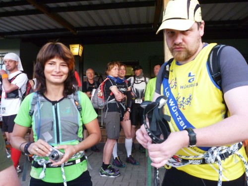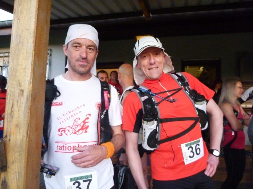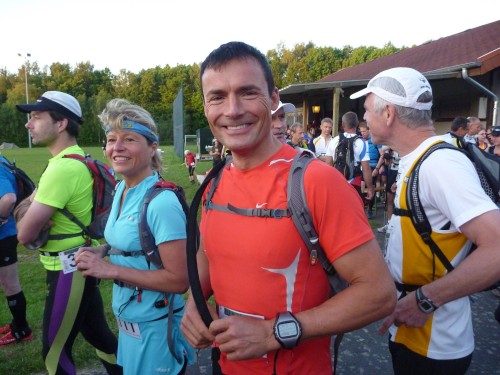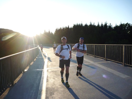 Erst auf dem um 6 Uhr geschossenen Startfoto entdecke ich Réné, den frischgebackenen Deutschen Meister. Kein Läufer wird ihn heute wiedersehen, er wird mit haushohem Abstand vor allen ins Ziel laufen. Für mich beginnt ein fast 15stündiger Lauf, für 30 % der Starter wird er in der Hitze des Tages an irgendeiner der zahlreichen Kontrollstellen früher enden.