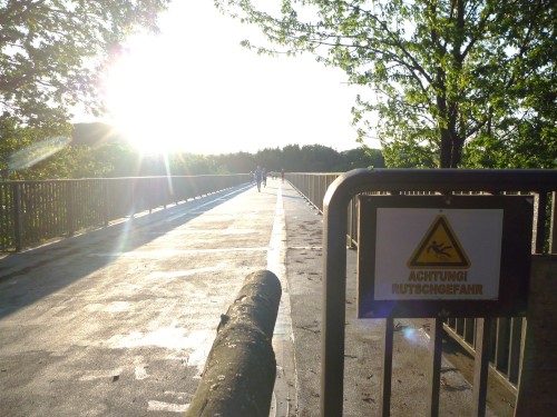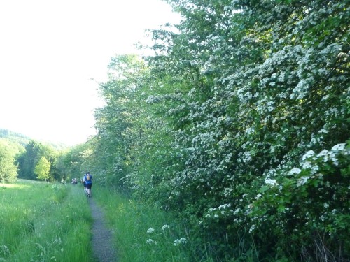 Wie immer brauche ich einige Zeit, um auf Wettkampflaune zu kommen. Zunächst bin ich nach den ersten Kilometern durch regelrechten Urwald schlag kaputt. Wie wird es im November sein, wenn ich den Khmer Pfad laufen werde? Bin dann froh, die alte Trasse der Ostertalbahn zu erreichen. Das alte Vorsignal signalisierte dem Zugführer den 400 Meter langen Bremsweg zum Bahnhof Schwarzerden. Der alte Eisenbahntunnel ist eine Laufattraktion. Hinter dem Tunnel ragen die gigantischen Blätter des Riesenbärenklau in die Laufstrecke. Die Blätter sind phototoxisch, das bedeutet, dass nach Berührung derselben und Sonnenlicht schwere Verbrennungen auftreten. Ich hatte zwar aufgepasst, dennoch am nächsten Tag dicke, eitrige Pusteln an den Armen. Dagegen hilft Arganöl, das ich mir von meinen Marokkoläufen mitgebracht hatte.