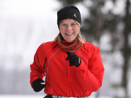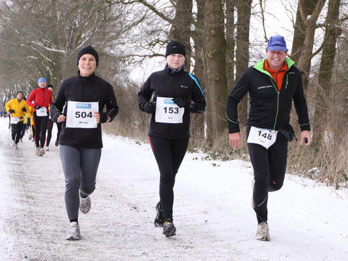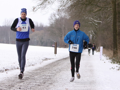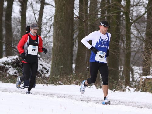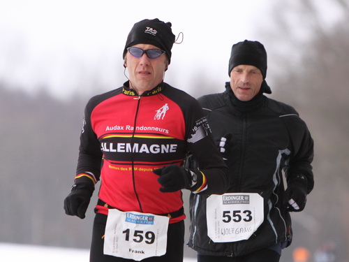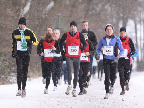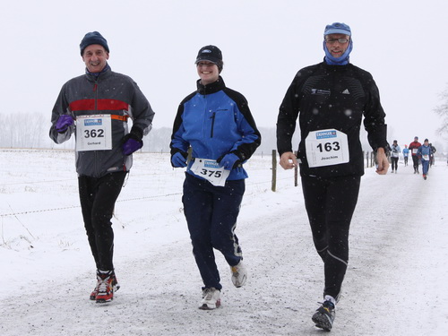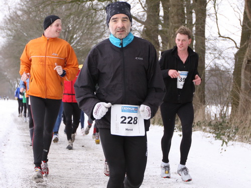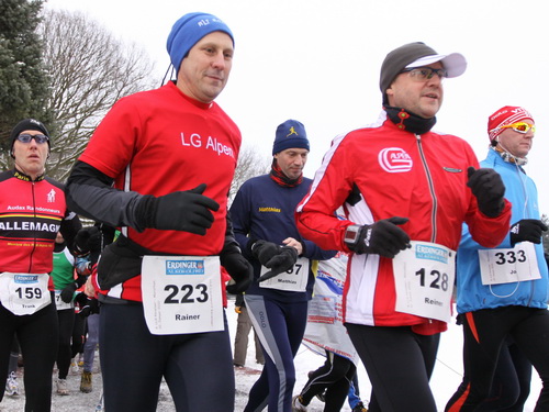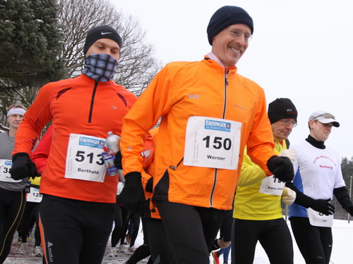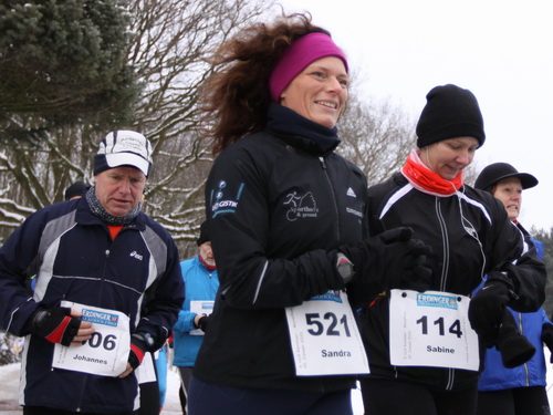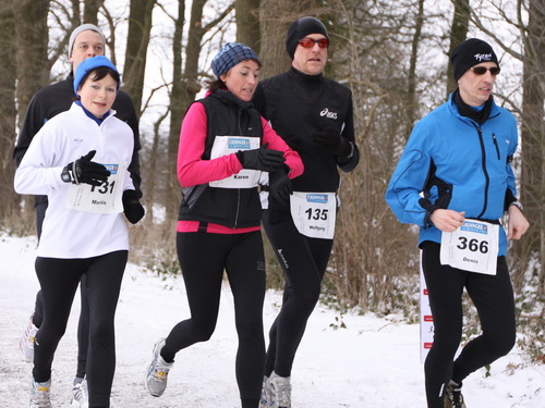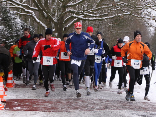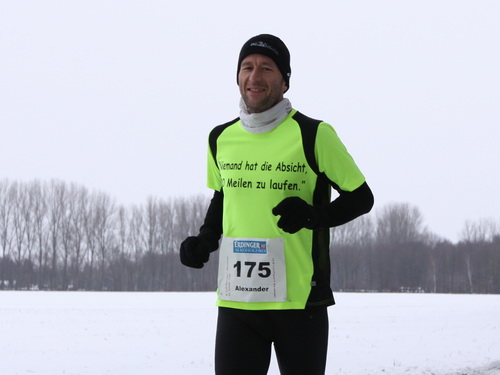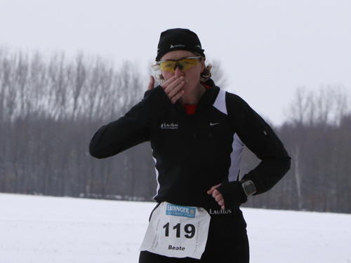 Ich kann mich in Runde eins in dieser Gruppe gut halten und sorge gar für ein wenig Führungsarbeit, die ich aber gern wieder abgebe. Die Einheimischen kennen die Strecke besser als ich und wissen vielleicht ihre Stärke hier auf diesem Kurs passend einzusetzen. Auf alle Fälle ist unser Laufuntergrund topfeben, auch wenn ich an einigen Kurven das Gas wegen der Schneeglätte ein wenig herausnehmen muss. Aber gerade die vermeintlich gefährlichen Stellen sind mit zusätzlichem Streugut gesichert.