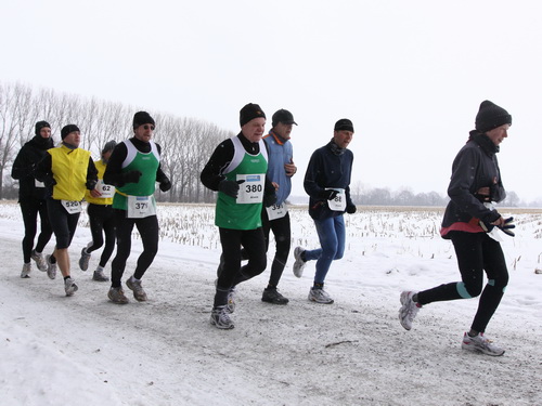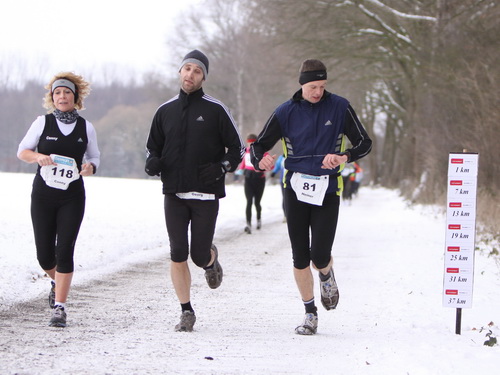 Wir laufen nun Richtung des Rundkurses, die ersten drei Marathonis haben sich bereits gelöst und ich befinde mich zu meiner Überraschung in der ersten Verfolgergruppe, die aus fünf, sechs Läufern besteht. Das Tempo erscheint mir nicht sehr hoch, vielleicht 4.30 Minuten pro Kilometer. In Anbetracht des Schneeuntergrundes vielleicht doch als schnell zu bewerten.