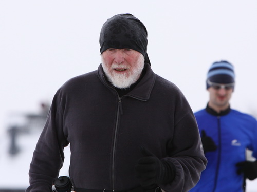 Am Wendepunkt lässt es sich nun besser laufen, denn der lockere Schnee ist vollends beseitigt. Immer wieder gibt es Zuspruch, ich kann nicht mehr antworten, hebe lediglich die Hand. Das Genick schmerzt. Ist es vielleicht die harte, nicht gewohnte Arbeit beim Holzeinschlag oder vielleicht schlicht der Seitenwind? Ich habe Probleme mich umzudrehen und lasse das dann bleiben. Wenn von hinten ein stärkerer kommt, dann kann ich den halt nicht mehr halten. Ist mir jetzt Wurscht.