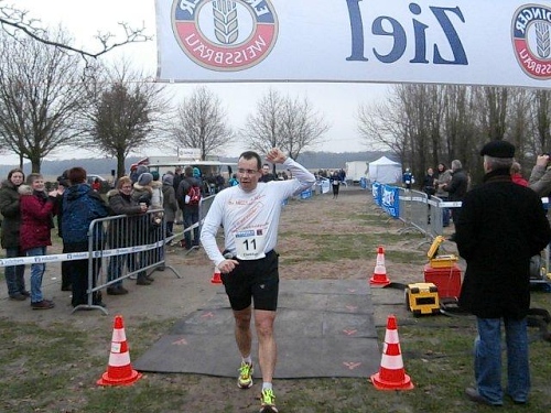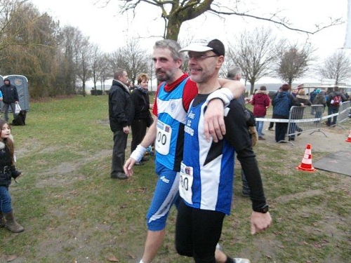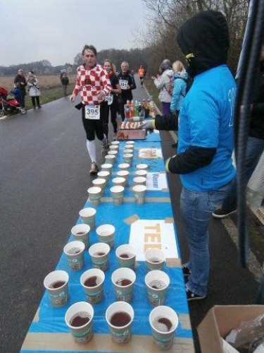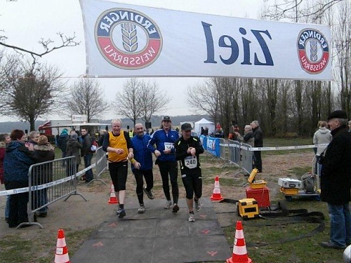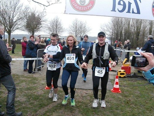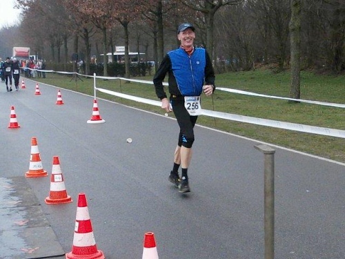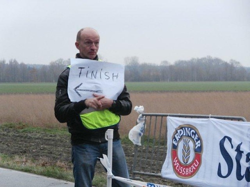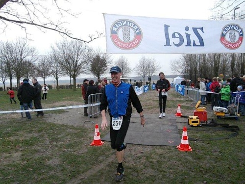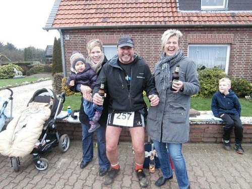 Dann signalisieren mir meine beiden Fans die letzte Runde und ich verabschiede mich schon mal an den Verpflegungsstellen von den freundlichen Helfern. Zum Abschluss der letzten Runde werde ich dann noch auf das 195 Meter lange Ausgleichsstück eingewiesen und es geht nun direkt ins Ziel. Nach 4:19:15 habe ich es geschafft und belege damit Platz 5 in meiner Altersklasse. Statt einer Medaille erhalte ich einen leckeren Honigkuchen und kann mich hier nochmals verpflegen. Auch alkoholfreies Weißbier ist jetzt dabei, da fängt das Neue Jahr gut an. Inge hat noch eine warme Jacke für mich und wir schauen uns noch den restlichen Zieleinlauf an. Bei 306 Finishern scheinen doch eine Menge Starter ausgestiegen zu sein. Ja, dass ist das Gefährliche, wenn man immer wieder am Ziel vorbeiläuft.