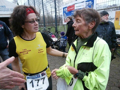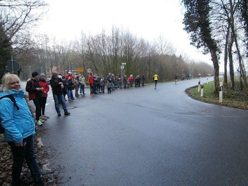An der Pendelstrecke gibt es wieder ein großes Hallo, wenn sich Bekannte treffen. Gleich siebenmal trifft man sich hier und kann beobachten, ob der Vorsprung schmilzt oder größer wird. Joe kommt mir entgegen und fotografiert wieder, was die Kamera hergibt. Kurz vor dem Wendepunkt erklärt der Moderator den Stand des Rennens und weiß über fast jeden Läufer eine kleine Geschichte zu erzählen. Inge und Christiane harren tapfer aus und feuern jeden Läufer an.