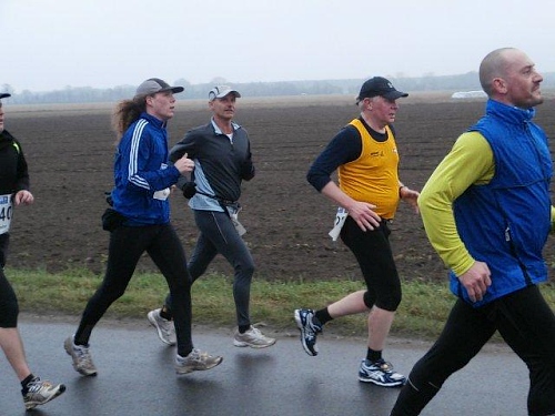 Ich habe mich bei den heutigen Temperaturen für eine leichtere Bekleidung entschieden, und komme damit bisher ganz gut zurecht. Von dick vermummt bis sommerlich luftig ist im Feld alles an Bekleidung vorhanden. Die Kilometerschilder passen ja für alle Runden und nach dem Verpflegungspunkt habe ich bald Kilometer 10 erreicht. Auch bei kühlen Temperaturen ist es wichtig, sich ausreichend an den Verpflegungsständen zu versorgen, denn der Kalorienverbrauch ist sogar etwas höher.