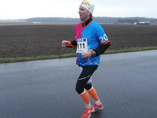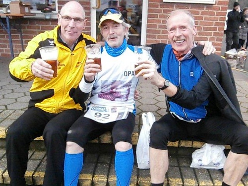 Auf der Pendelstrecke bin ich froh, dass nun die gesamte Strecke asphaltiert ist. In den Vorjahren war dies an der Jugendherberge nicht der Fall und der Untergrund wurde dann immer von Runde zu Runde tiefer. Das hat dann doch noch zusätzlich Kraft gekostet. Ich versorge mich jetzt an den Verpflegungspunkten auch noch mit Bananen- und Honigkuchenstücken. Mit der fünften Runde haben wir dann Kilometer 30 erreicht und die ersten Läufer walken schon mal ein Stück. Mir fallen die vielen älteren Läufer auf, bei denen der Kevelaer Marathon sehr beliebt ist. Mit Gerd Papcke ist sogar ein Läufer in der M80 unterwegs.