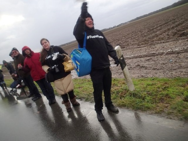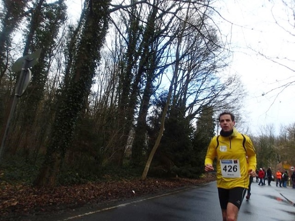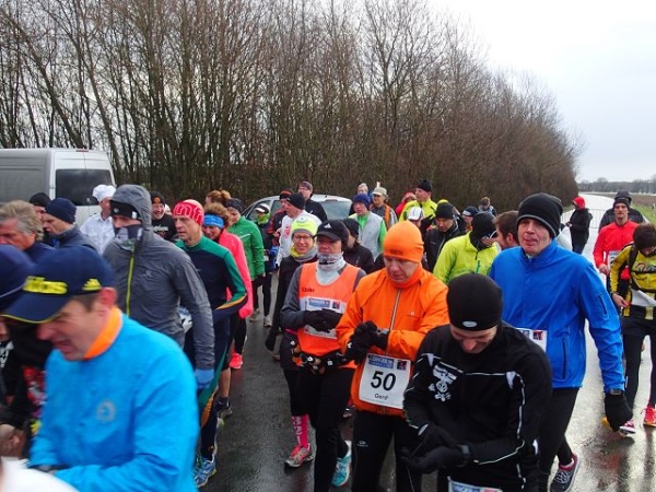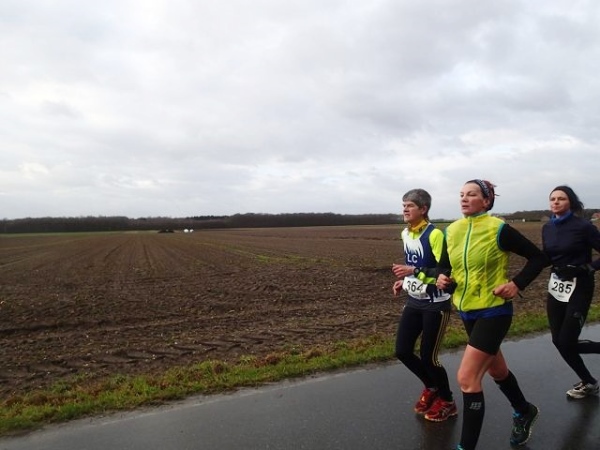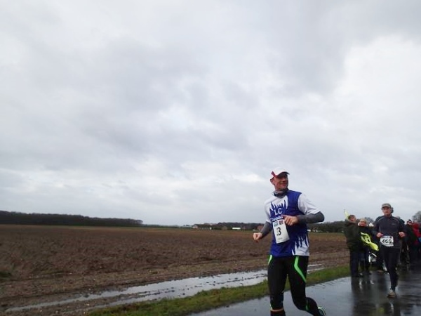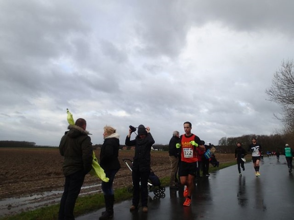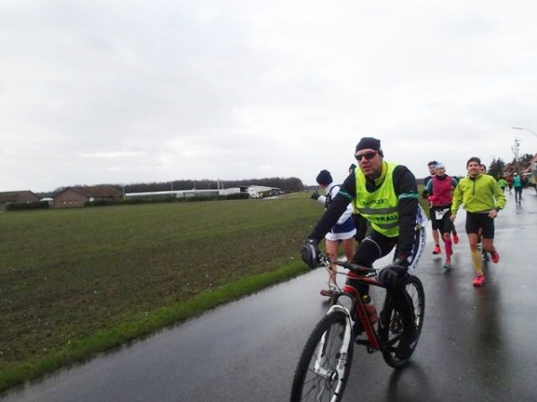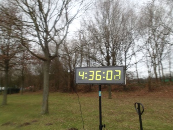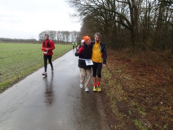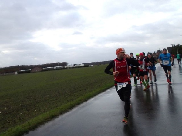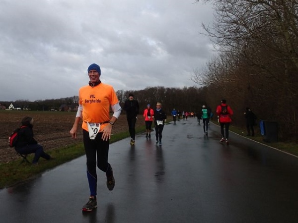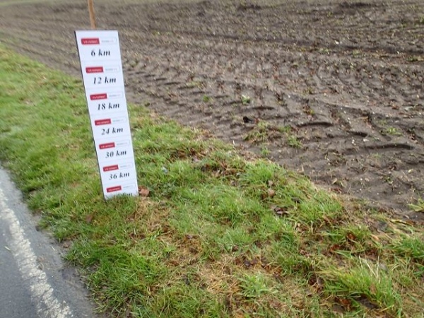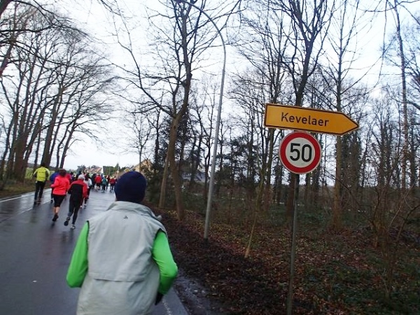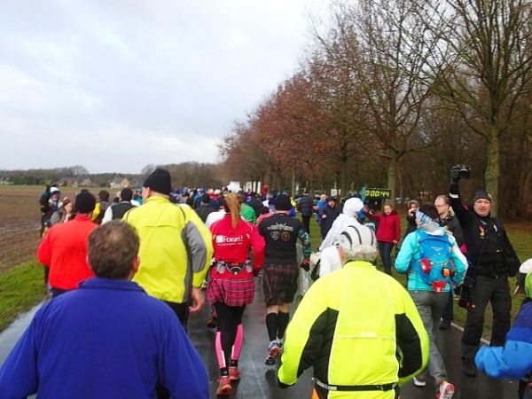Es regnet die ganze Zeit. Den ehrwürdigen Truck Emma, an dem früher immer richtig fette Musik gemacht wurde, gibt es immer noch. Die Musik kommt aus einem neumodischen Fahrzeug, das daneben parkt. Hier geht es scharf nach links. Wir laufen die nächsten 1,5 km parallel zur Deutsch/Niederländischen Grenze. Bei km 2,5 ist dann die erste Verpflegungsstelle. Ab hier lässt endlich der scharfe Gegenwind nach. Bei km 3,5 verlassen wir dann das Kuckucksfeld, der folgende Bereich nennt sich Kervendonk. Der Regen geht in Graupel über. Zum Glück ist man jetzt im Wald etwas geschützt. Ab km 4,5 haben wir dann sogar Rückenwind, allerdings nur in einer Richtung der Begegnungsstrecke. Der Barfußläufer, den ich am Start gesehen habe, hält tapfer bis km 18 durch, dann braucht auch er etwas warmes an den Füßen.