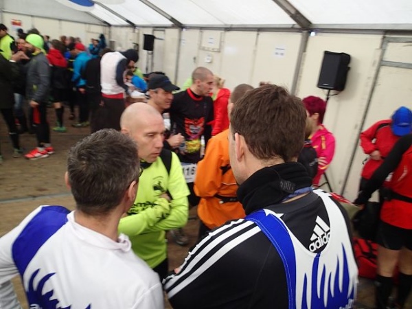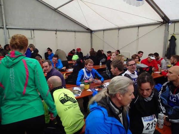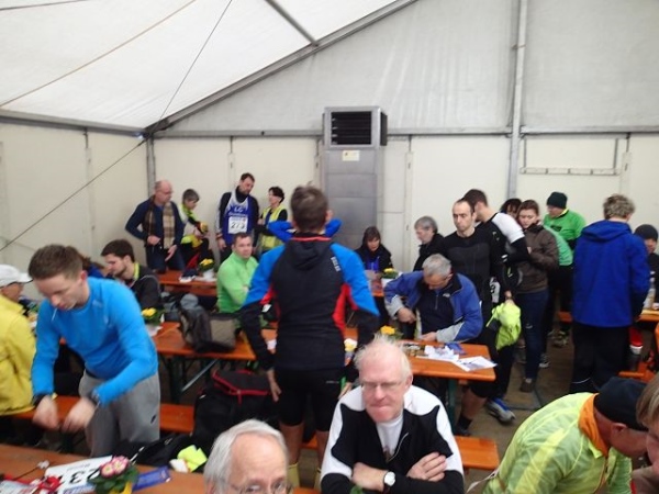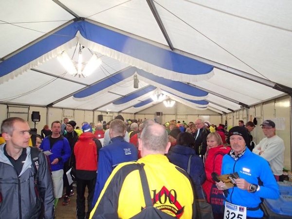 Alles liegt hier o sehr zentral. Im Festzelt am Sportplatz gibt es sogar Frühstück und Kuchen. Der angebotene Kaffee wird auch sehr gerne angenommen, denn heute ist es mit 4 Grad sehr kalt. Gestern waren es noch 15 Grad. Der Wind weht immer noch stürmisch, sodaß sich fast alle Starter im großen Festzelt tummeln. Erst 5 Minuten vor dem Start bewegt man sich in dessen Richtung.