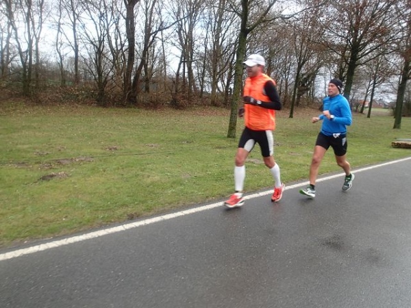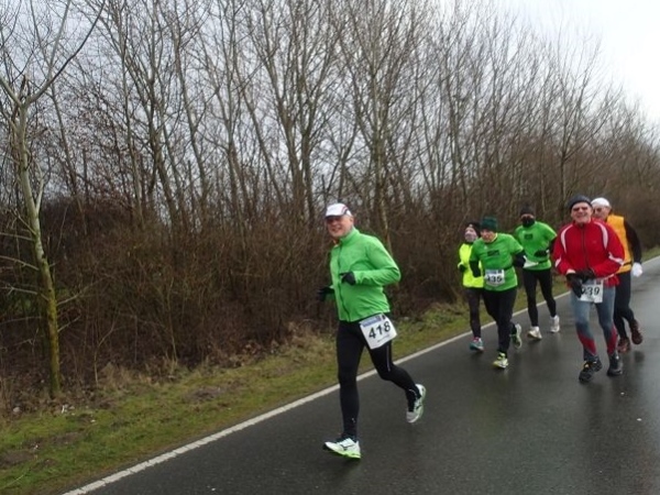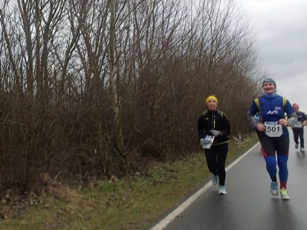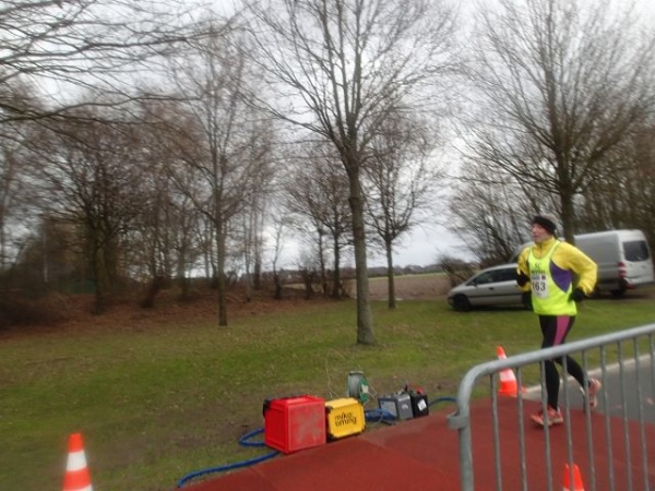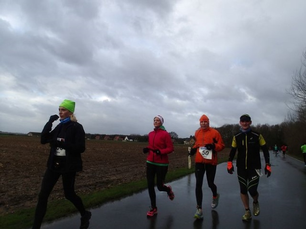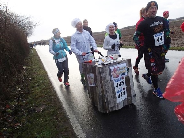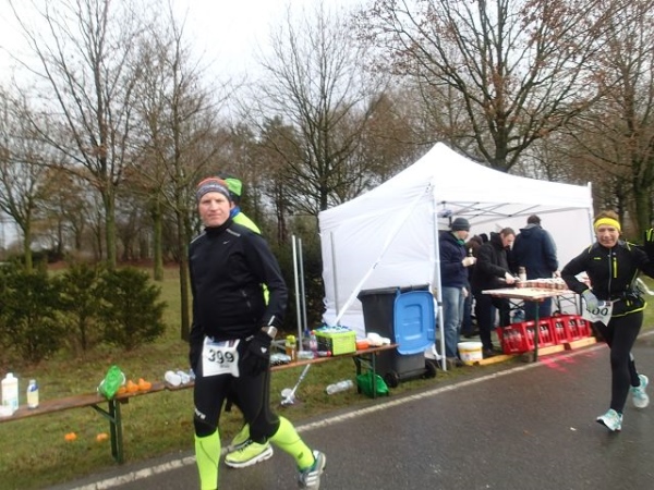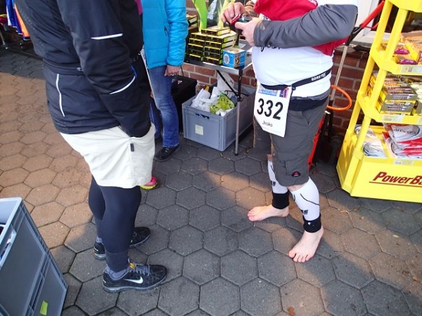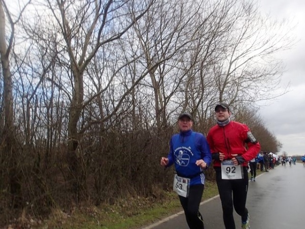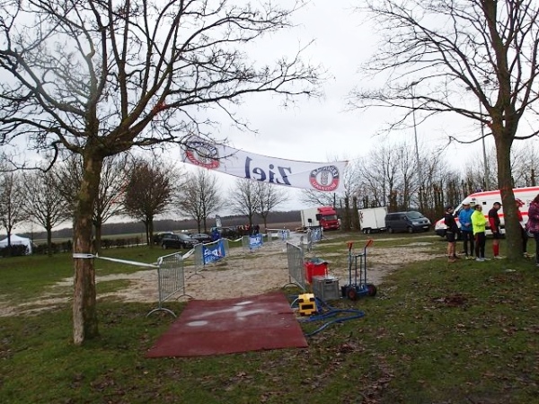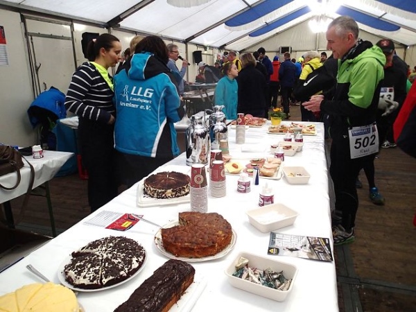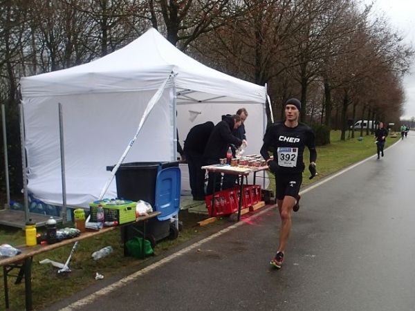 7 Runden mit 2 VP’s sind zu laufen. Die Strecke ist extrem flach, aber wie beschrieben teilweise auch sehr windanfällig, was wir heute besonders zu spüren bekommen. Dabei fühlen sich die gemessenen 5 Grad deutlich kälter an. An den Versorgungspunkten gibt es Tee und Cola in den Varianten kalt und warm. Selbstverständlich „laufen“ heute die warmen Getränke besser. Dazu gibt es Bananen und Äpfeln und zum Glück zumindest auf der Strecke den beliebten Honigkuchen.