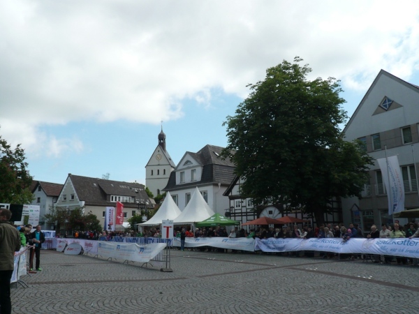 Auf dem Startplatz treffen so nach und nach rund 650 Läufer ein. Es sind nur noch wenige Minuten bis zum Start und in den vorderen Reihen wird es etwas eng, weil viele, vor allem 10km Läufer, aus der ersten Reihe starten wollen. Die Marathonis, die man an den unterschiedlichen Farben der Startnummer erkennt, reihen sich mehr nach hinten ein. Dann erfolgt der Startschuss und die Meute hetzt los durch die schmale Marktstraße. Schon nach 200m geht es über den großen und breiten Marktplatz vorbei am späteren Zieleinlauf.