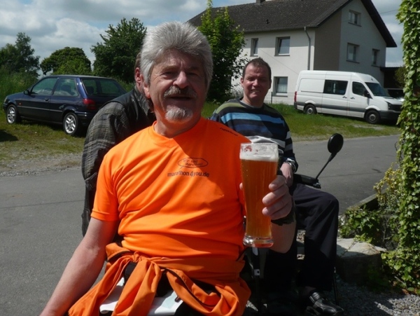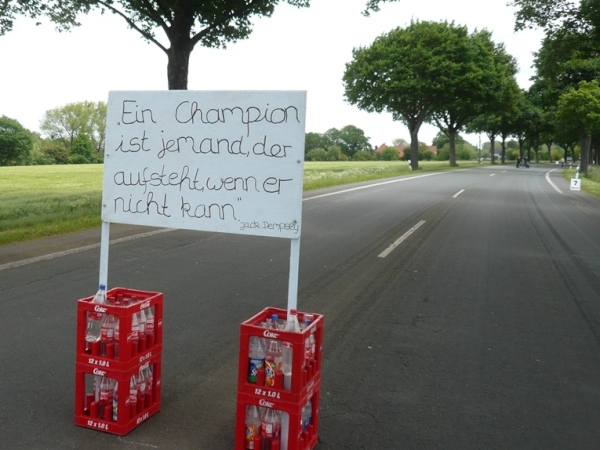 Nach Km 14 kommen wir wieder zum Stimmungsnest in Klein-Verne. Für die nächste Runde bestelle ich mir alkoholfreies Weizenbier und Kuchen. „Vorsicht angetrunkener Schütze auf allen Vieren“ soll das Warnschild bedeuten. Die Verner sind auch hier am Feiern.