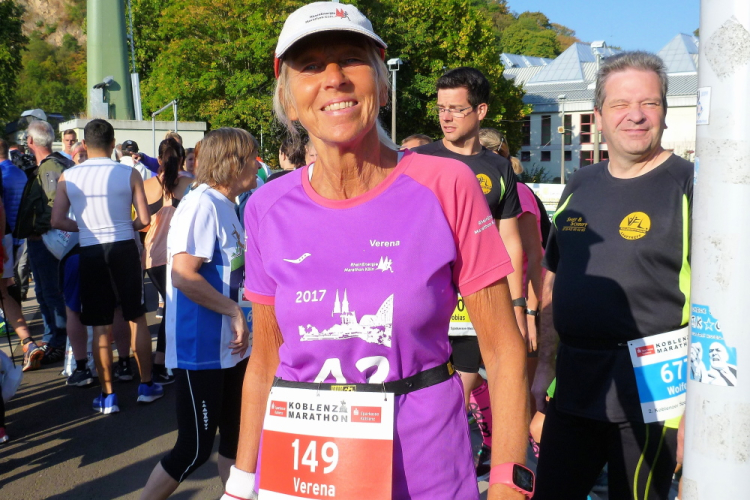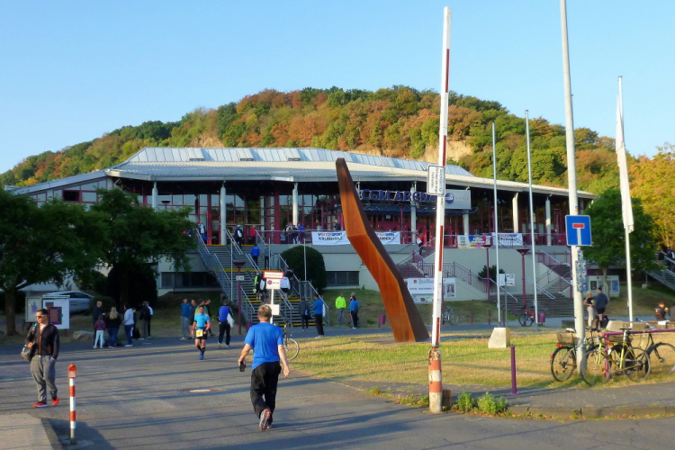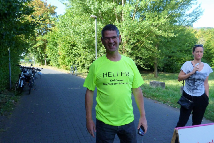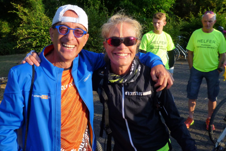 Eine Überraschung erlebe ich, als ich nach einer guten halben Stunde Autofahrt um Punkt 8 Uhr, eine Stunde vor dem Start des Marathons und Halbmarathons, auf dem großen Parkplatz an der CGM-Arena (Sporthalle Oberwerth) eintreffe: Ich ergattere mit Glück den fünftletzten Parkplatz! Steigende Teilnehmerzahlen haben eben auch mehr Straßenverkehr zur Folge. Vor der Halle bereiten sich die Begleitradfahrer vor. Dass Antje nicht nur als Person, sondern auch als Läuferin klasse ist, war mir hinlänglich bekannt. Wer aber gestern beim SONUT über 62 km und 2.100 HM die Frauenkonkurrenz gewinnt und heute die 2. Marathonfrau radelnd begleitet, um die Beine auszuschütteln, ist schon außergewöhnlich gut drauf.