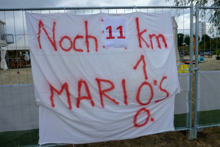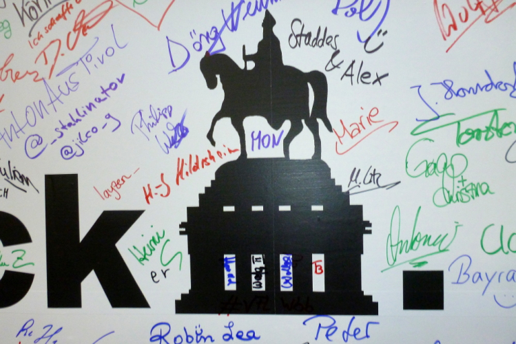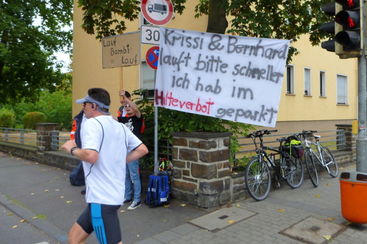 Auf der großen Plakatwand, die viele Unterschriften zieren, verewigen wir uns zwischen den Säulen des Podestes für das Reiterstandbild Kaiser Wilhelm I. Die Art und Weise der Kleiderbeutelabgabe hat man zwar geändert, gebessert hat sich aber leider nichts. Daher bilden sich auch in diesem Jahr wieder lange Schlangen. Es bietet sich an, erst einmal große Haufen zu bilden und diese während des Laufs in Ruhe zu sortieren.