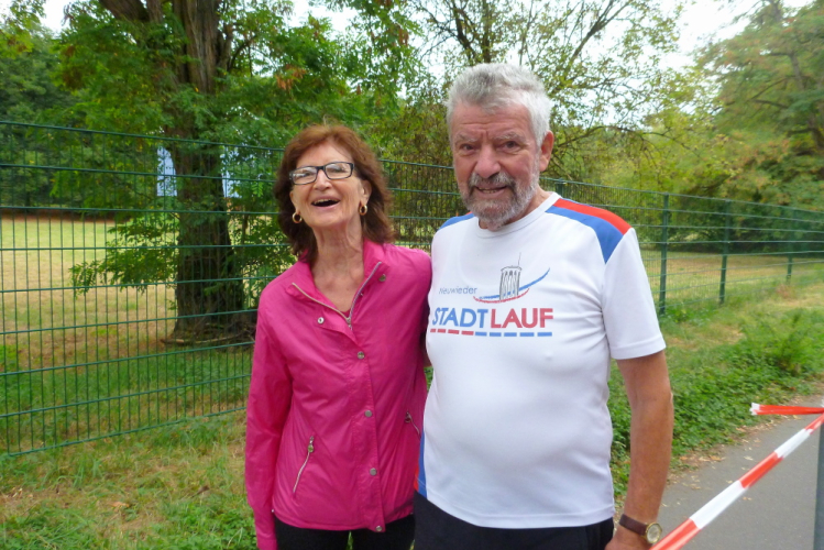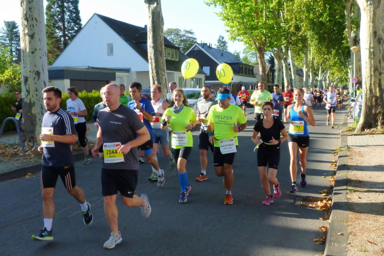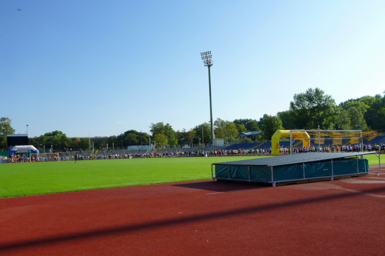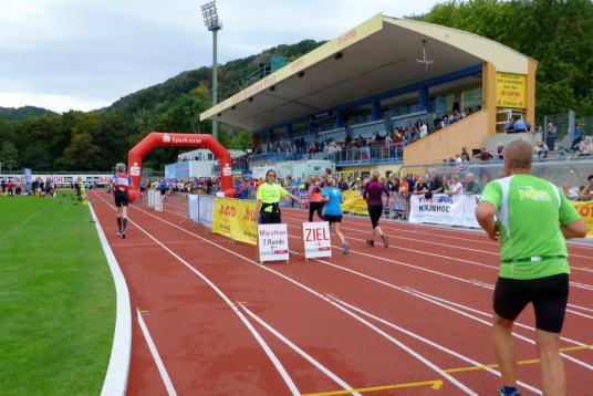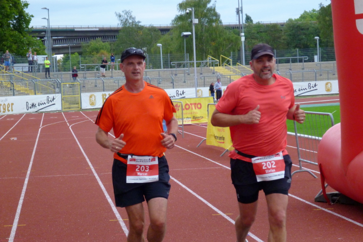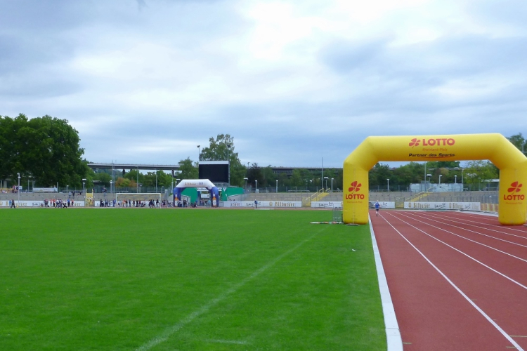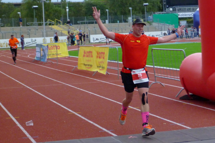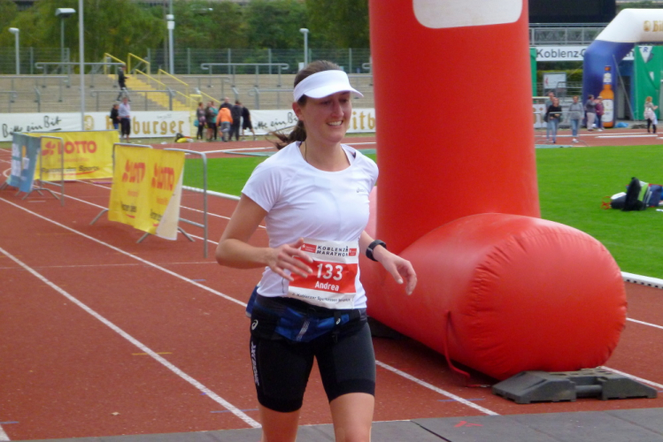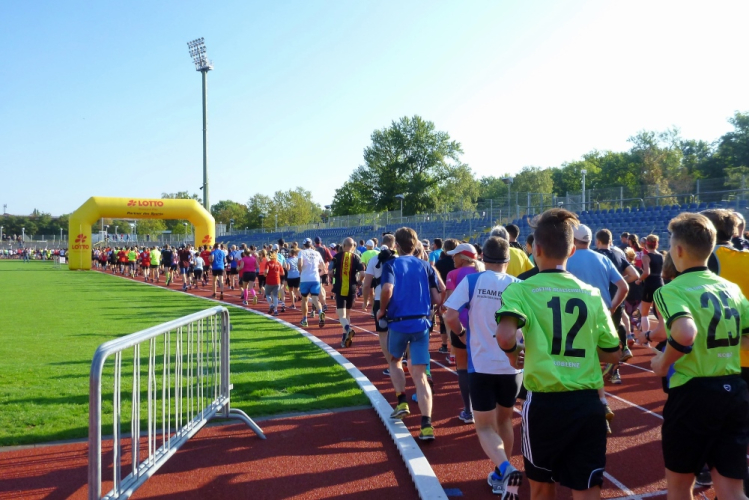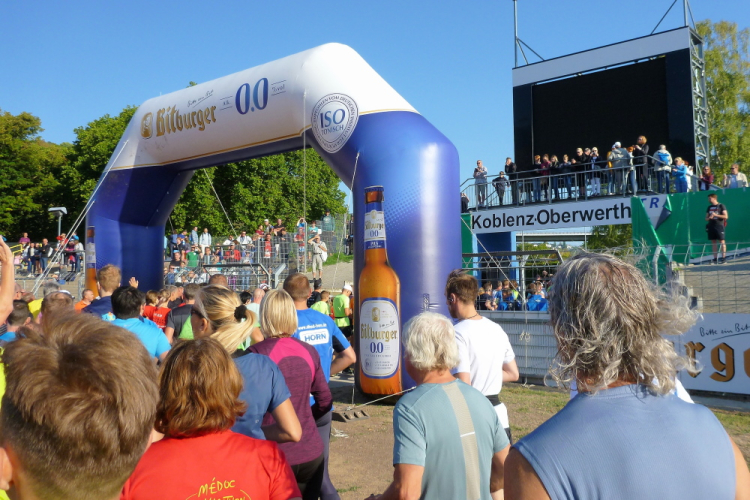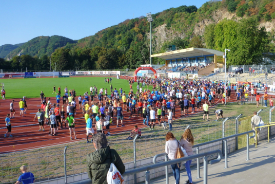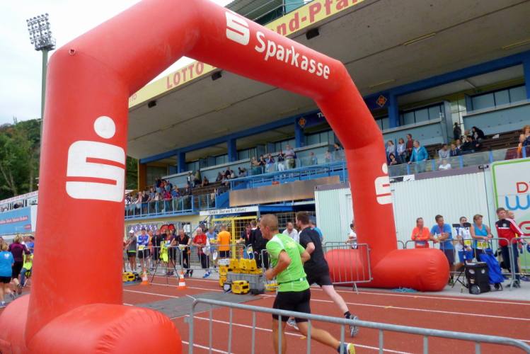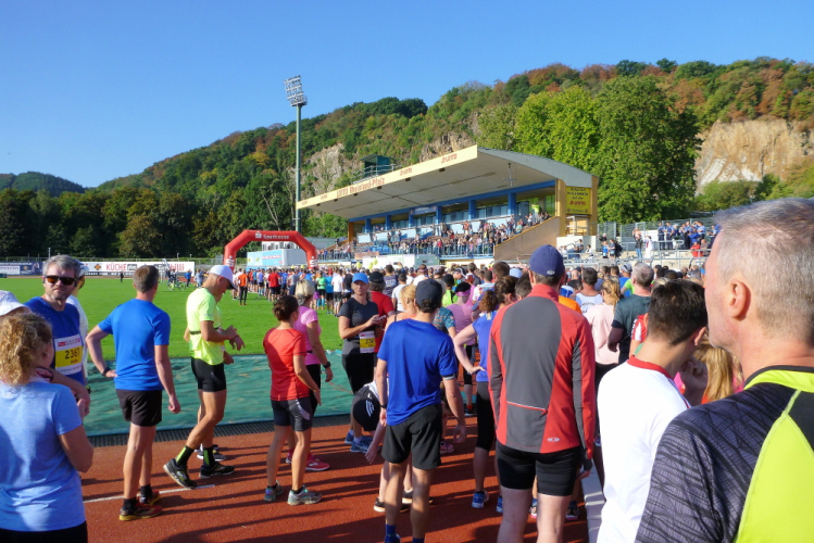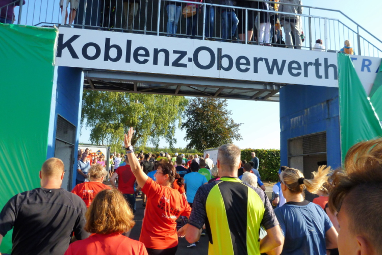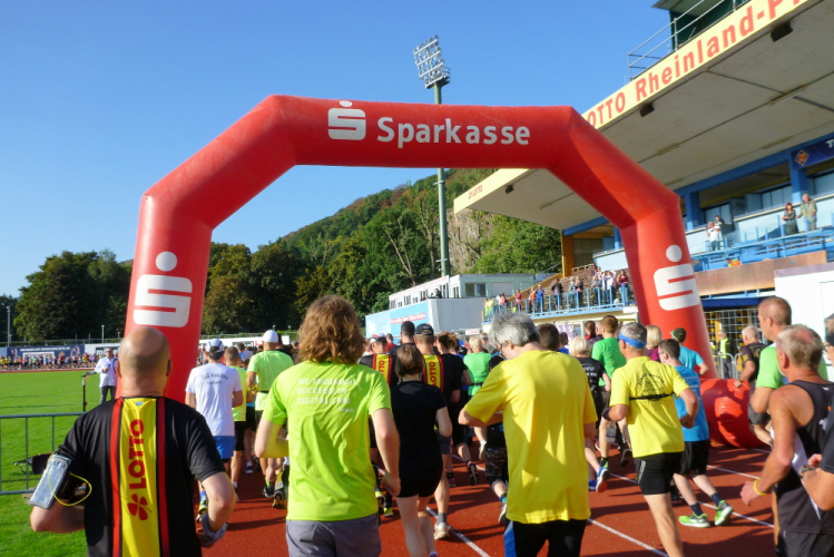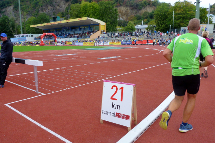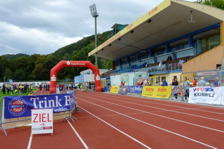 Dann treibt es uns nach draußen ins parallel gelegene Stadion (Heimat der TuS Koblenz und ehemaliger Austragungsort des legendären Koblenzer Abendsportfestes), in dem erstmals Start und Ziel liegen. Sinnvollerweise werden die (Halb)Marathoner um 9 Uhr, eine halbe Stunde vor den Zehnern, losgelassen. So haben uns die „Sprinter“ rechtzeitig aus den Füßen und freie Bahn. Die Kölnerin Verena lobt uns rasende Reporter über den Klee, da wird es höchste Zeit, das Ganze auch durch Leistung zu untermauern. Bei strahlendem Sonnenschein geht es pünktlich los, knapp 1.400 Aktive über M und HM werden im Ziel gezählt, dazu kommen einige Viererstaffeln über 42,2 km. Es geht aufwärts. Bemerkenswert: Mit 400 Frauen gegenüber 792 Männern ist die Frauenquote beim Halben ziemlich hoch. Dagegen spiegeln beim Marathon die 30 Mädels gegenüber 174 Jungs das eher übliche Bild wider.
