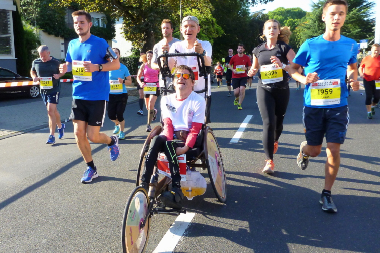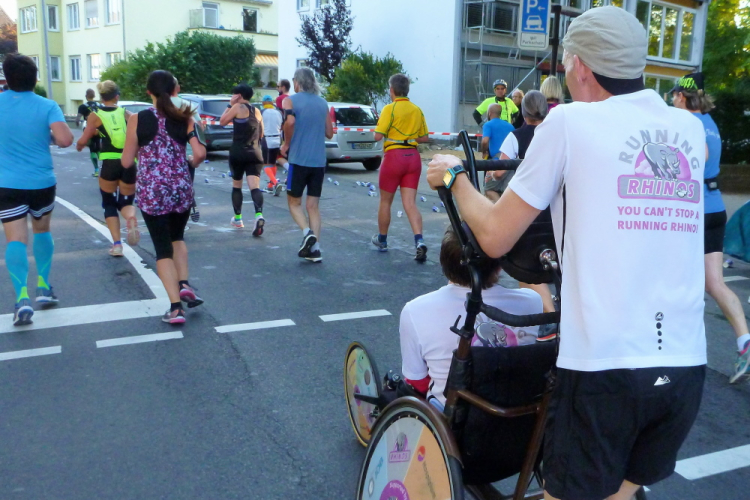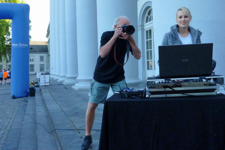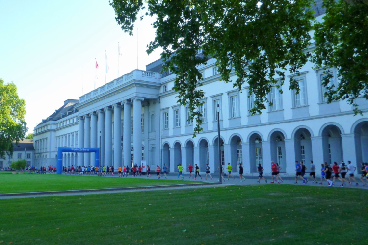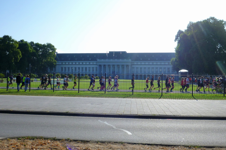 Los geht es über vom Vorjahr bekanntes Terrain: Aus dem Stadion unter der Südbrücke und der Eisenbahnstrecke hindurch auf die lange, platanengesäumte Schillerstraße durch den beliebten Stadtteil Oberwerth, eine ehemalige Rheininsel, den wir am Kreisel verlassen. Schon sind wir mit der nicht minder langen Mainzer Straße auf dem „Festland“, deren Länge aber angesichts des noch dicht gedrängten Teilnehmerfeldes nicht weiter auffällt. Schwer beeindruckt mich Stan vom SV Rhinos Wiesbaden e.V., der den körperbehinderten Stephan im Rennrolli über die 42,2 km in wenig mehr als vier Stunden schiebt, großer Respekt! Schon sind wir auf Höhe der sog. Neustadt, den Rhein-Mosel-Ring unterquerend, angekommen. Rechterhand liegt das kurfürstliche, nach dem Krieg wiederaufgebaute Schloss mit seinen Zirkularbauten. Heute dient es profanen Zwecken und uns als willkommene Kulisse für eine wunderbare Runde um seinen Vorplatz. Jörg von der Rhein-Zeitung knipst neben einer DJ die schönsten Bilder, ich bin natürlich nicht dabei. Frechheit. Komm' Du nochmal nach Waldbreitbach!