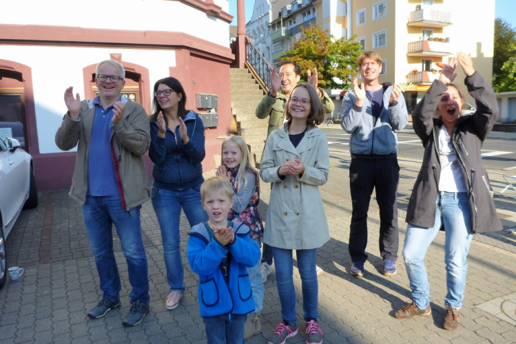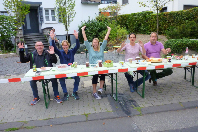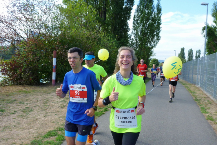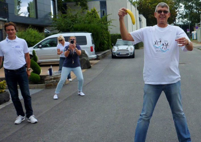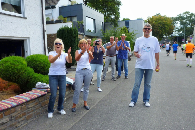 Auf der anderen Moselseite angekommen, müssen wir zunächst eine Mini-Begegnungsstrecke nehmen, auf der ich die 4:30-Zugläufer überhole, die tapfer im Sechserschnitt (also auf 4:13 Std.-Kurs) unterwegs sind. Zu ihrer Ehrenrettung sei aber gesagt, dass sie mit knappen 4:29 Std. exakt im Soll angekommen sind. Hier steht vom Ausrichter mein Lieblings-Wolfgang und freut sich schon auf unseren Lauftreff beim nächstjährigen Lauf Rund um die CGM-Arena. Wie immer vorbildlich ist die Versorgung mit Getränken (Wasser, Iso und später Cola), etwas zu beißen gibt es an anderer Stelle auch. Der ehemalige Treidelpfad (zum Ziehen der Schiffe) und heutige Spazier- und Radweg ist zwar eng, aber völlig ausreichend. Von ihm aus kann man einige herrliche Gärten bewundern, die zu den hoch über ihnen liegende Häusern auf der Trierer und Mayener Straße gehören. Nach der anderen Seite der Staustufe kommen wir in die Weinbergstraße, wo meine lieben Kollegen Martina und Joachim mit einigen Freunden ein kleines Straßenfest feiern und als meine persönliche Verpflegungsstation besonders positiv auffallen. Herzlichen Dank dafür, insbesondere auch für die spontane Hopfenkaltschale beim zweiten Mal!