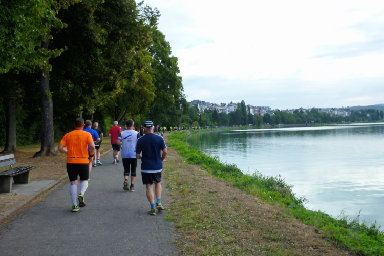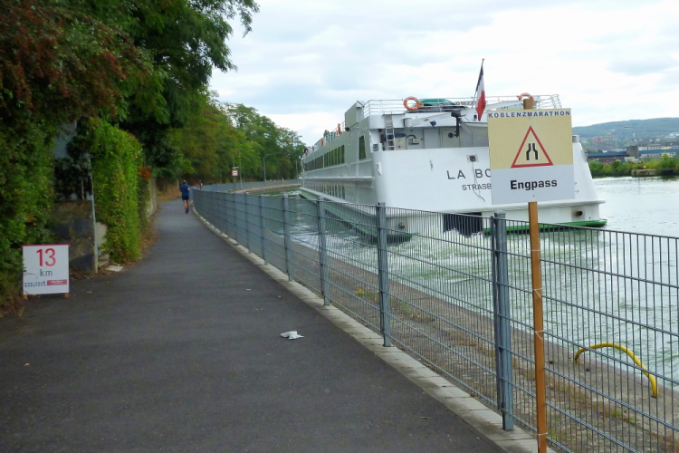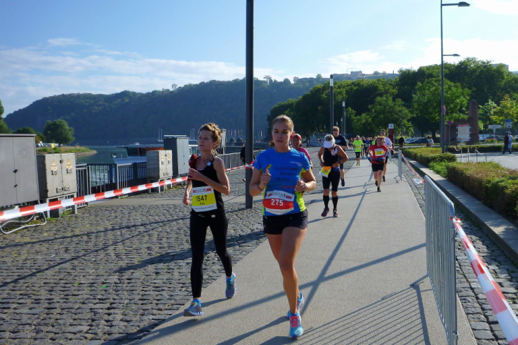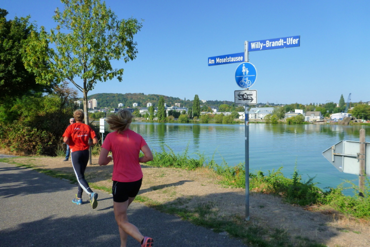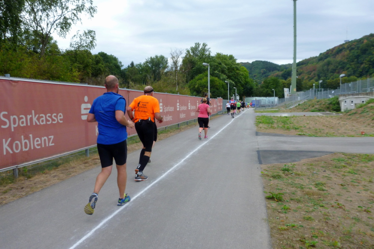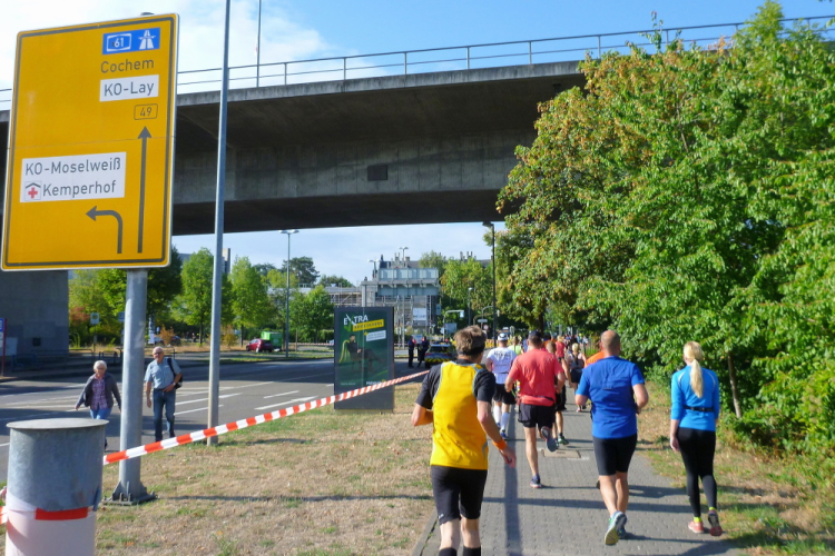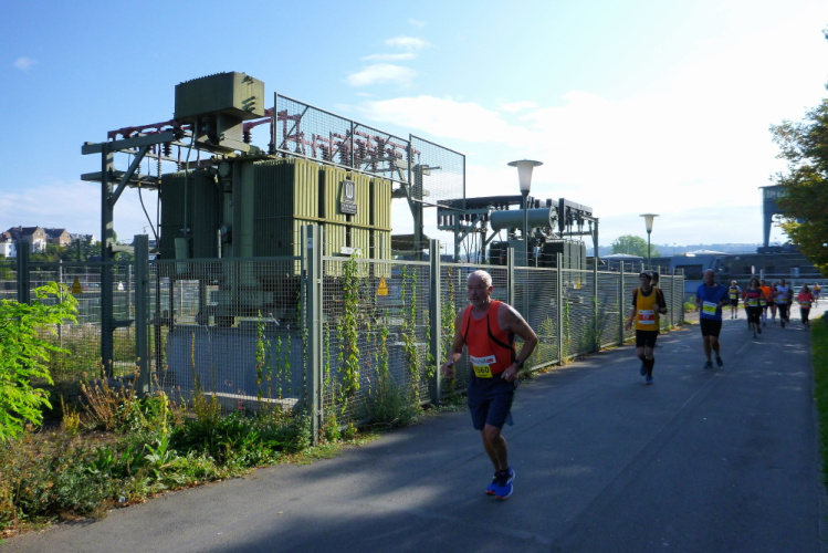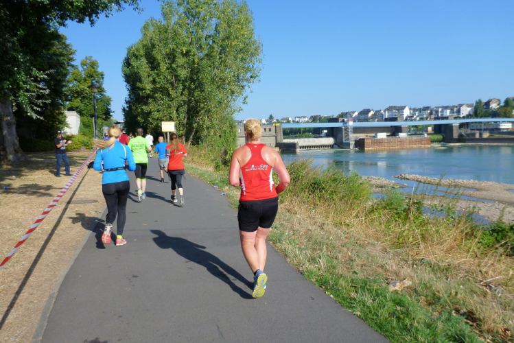Wir bleiben geradeaus und bewegen uns moselaufwärts weiter. Die im vergangenen Jahr angebotene 21,1 km-Runde hatte, weil sie auf der zweiten Hälfte lange durchs Industriegebiet führte, viel Kritik einstecken müssen. Daher hat man reagiert und das in diesem Jahr komplett geändert, auch wenn der Maßnahme zuschauerintensive Straßen in Lützel, Neuendorf und Wallersheim zum Opfer gefallen sind. Aber die Entscheidung wird als richtig empfunden, wie mir zahlreiche Mitstreiter begeistert erzählen. Wir unterqueren die Eisenbahn- und die Europabrücke und haben bei traumhaftem Wetter allerbeste Voraussetzungen und immer etwas zu schauen. Beeindruckend ist auch die Staustufe, von der man bei dem derzeitig niedrigen Wasserstand besonders viel sehen kann. Viele Jogger nutzen gerade sie beim Training, um das Gewässer zu überqueren.