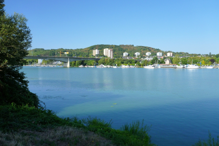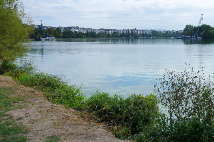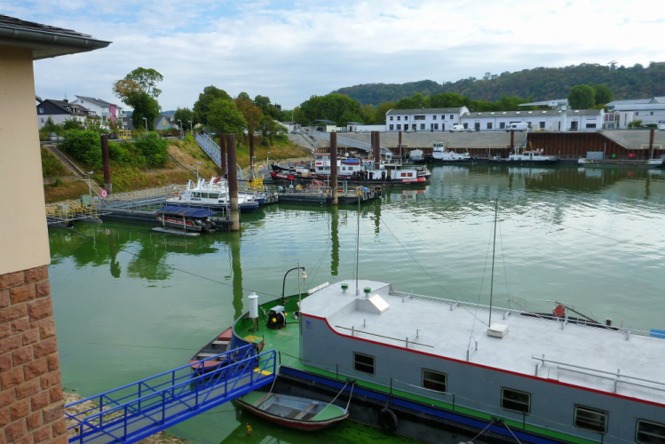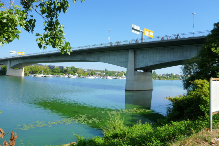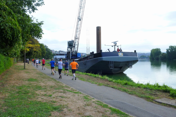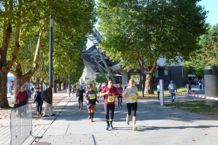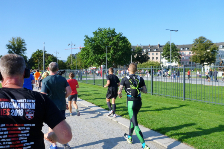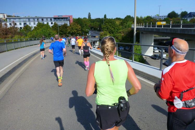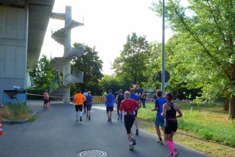 Wir bleiben geradeaus und bewegen uns moselaufwärts weiter. Die im vergangenen Jahr angebotene 21,1 km-Runde hatte, weil sie auf der zweiten Hälfte lange durchs Industriegebiet führte, viel Kritik einstecken müssen. Daher hat man reagiert und das in diesem Jahr komplett geändert, auch wenn der Maßnahme zuschauerintensive Straßen in Lützel, Neuendorf und Wallersheim zum Opfer gefallen sind. Aber die Entscheidung wird als richtig empfunden, wie mir zahlreiche Mitstreiter begeistert erzählen. Wir unterqueren die Eisenbahn- und die Europabrücke und haben bei traumhaftem Wetter allerbeste Voraussetzungen und immer etwas zu schauen. Beeindruckend ist auch die Staustufe, von der man bei dem derzeitig niedrigen Wasserstand besonders viel sehen kann. Viele Jogger nutzen gerade sie beim Training, um das Gewässer zu überqueren.