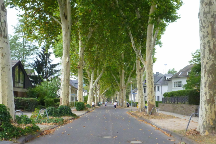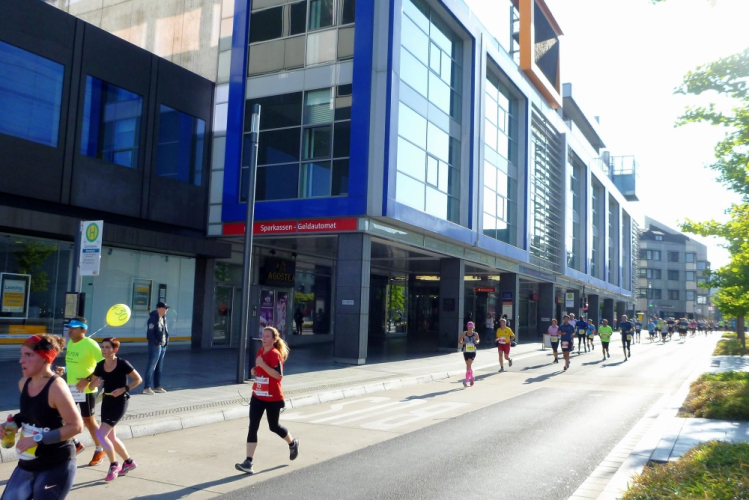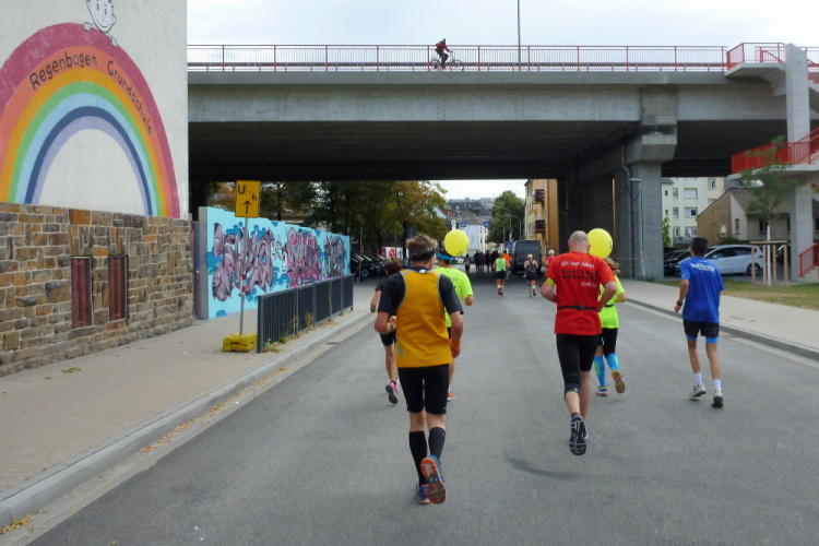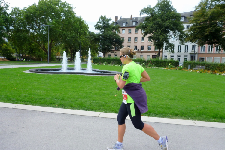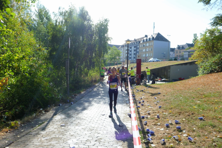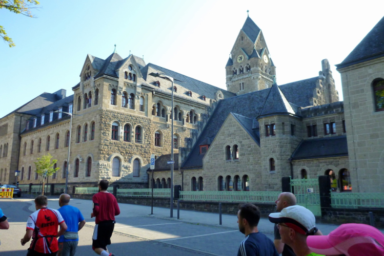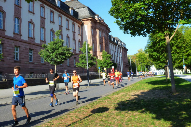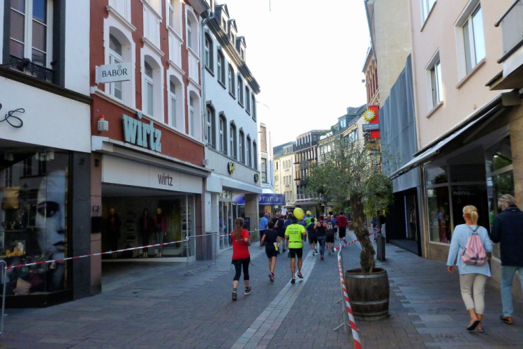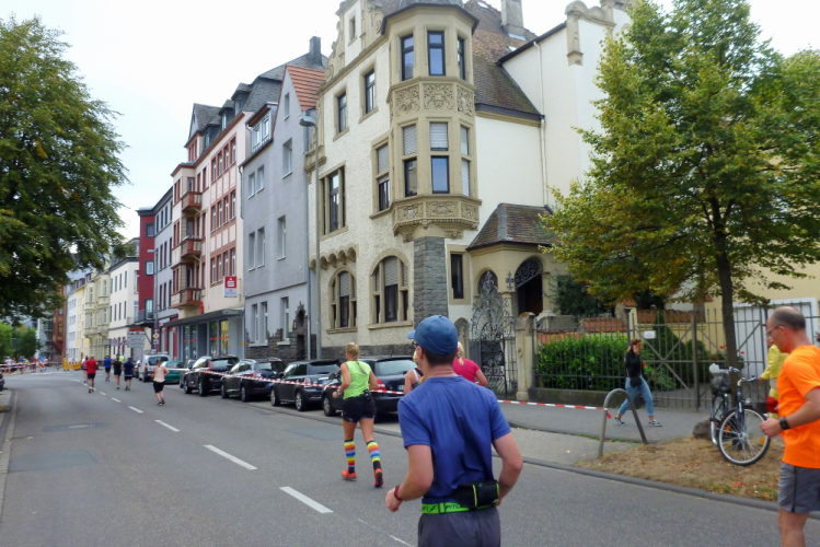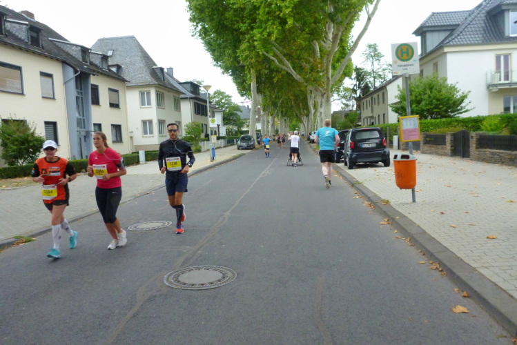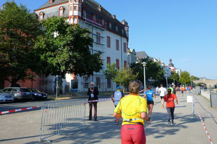 An Löhrcenter und Herz-Jesu-Kirche biegen wir auf die Schlossstraße ein, die nach totaler Kriegszerstörung auf dem besten Wege ist, ihre einstige Bedeutung als wichtige Einkaufsstraße auch optisch wiederzuerlangen. Wieder dürfen wir das Schloss bewundern, vor dem es allerdings nach rechts wieder auf die Mainzer Straße in Richtung Südstadt und damit zum Stadion geht. Hier kommt mir u.a. im Sauseschritt Lisa entgegen, die die Frauenwertung in 3:08 Std. mit fast zwanzig Minuten Vorsprung für sich entscheiden wird. Am Ende ist der Wendepunkt früher platziert als im vergangenen Jahr, schon sind wir wieder auf Oberwerth und mich trennt nur noch die Schillerstraße von der Halbzeit.