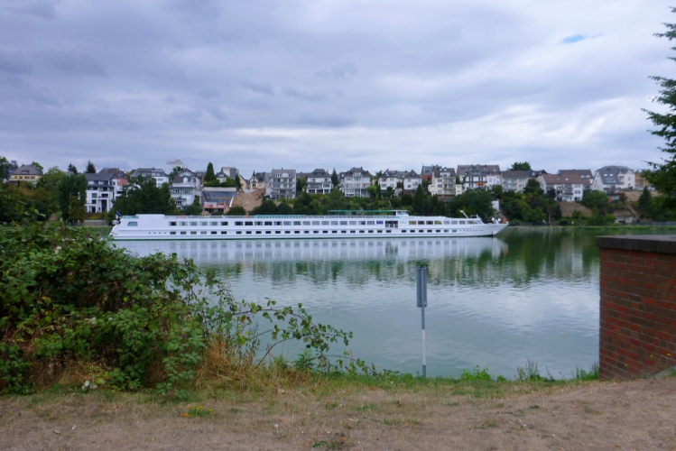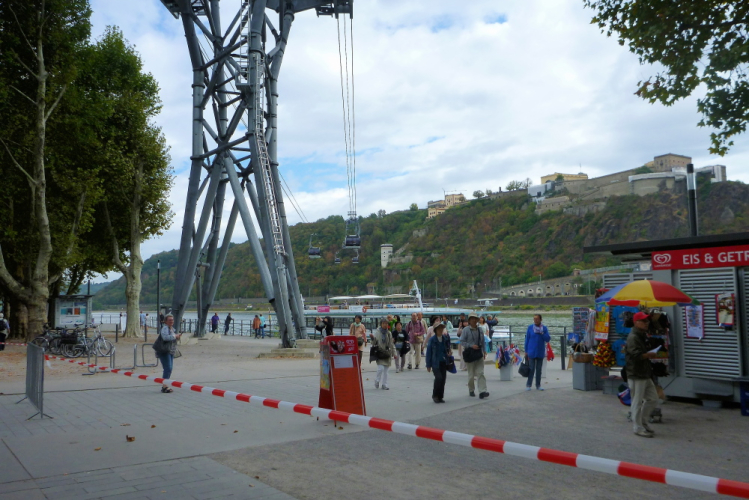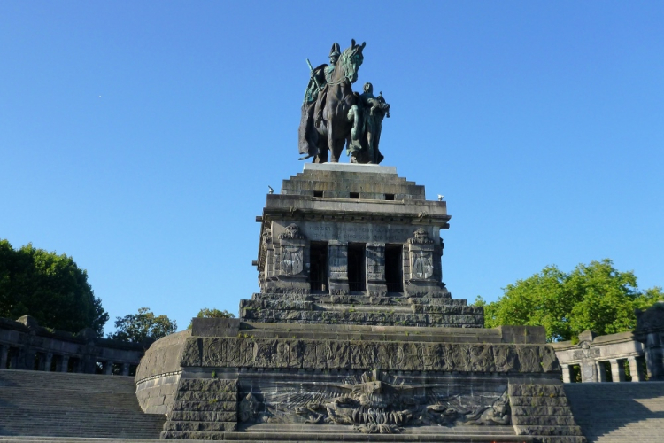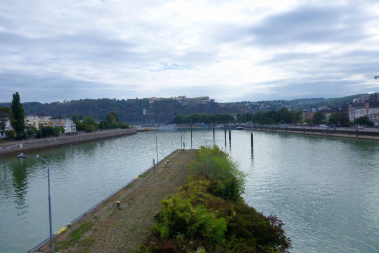 War der Kurs bisher schon nicht schlecht, wird er jetzt richtig toll. Auf der gegenüberliegenden Rheinseite thront über dem gleichnamigen Stadtteil die beeindruckende Großfestung Ehrenbreitstein, mit deren Hilfe inkl. dreier weiterer Festungen man den Schiffsverkehr auf Rhein und Mosel im Griff hatte. Dieser Ort gehört zweifelsfrei zu den deutschen Plätzen, die man nicht gesehen haben sollte, sondern muss. Der Blick auf die Stadt Koblenz und das Deutsche Eck, ach, über das gesamte Neuwieder Becken, ist unvergleichlich beeindruckend. Seit der Bundesgartenschau verbindet eine Seilbahn Koblenz und die Festung, zum beiderseitigen großen Vorteil. Wir unterqueren deren Talstation und umrunden das Deutsche Eck. Ursprünglich eine Sandbank (seinerzeit Hundsschwanz als letzter Ausläufer des Hunsrücks genannt), wurde der Zusammenfluss von Mutter Mosel und Vater Rhein im Zuge der Anlage des Denkmals für Kaiser Wilhelm I. aufgeschüttet und befestigt. Das beeindruckende Denkmal (m.W. das größte Reiterstandbild zumindest Europas) ist der Hammer und größter Publikumsmagnet der Stadt. Seit exakt 25 Jahren sitzt der Hohenzoller nach Kriegszerstörung wieder dort, daher ziert sein Abbild die diesjährige Medaille.