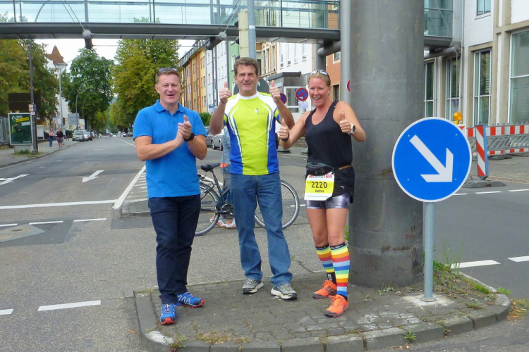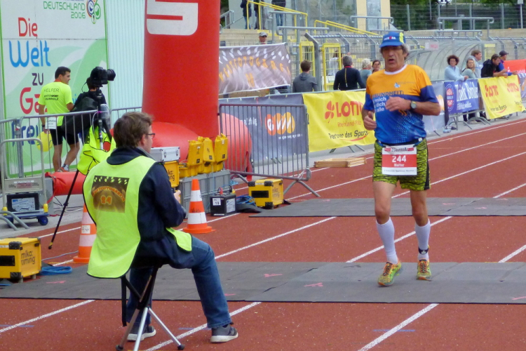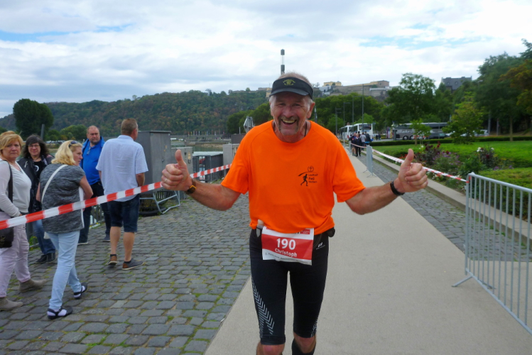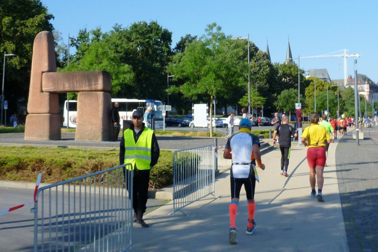 Aber der Rest ist natürlich wieder toll: Schloss, Altstadt, Deutsches Eck, beidseitiges Moselufer, Balduinbrücke, die langen Einkaufsmeilen, das hat schon etwas. Nur kaum Zuschauer, vom Kaiser-Wilhelm-Denkmal abgesehen. Wie immer – aber wem geht das anders? - bin ich froh, als die 40 km-Marke erscheint und der Rest absehbar wird. Wenigstens habe ich mich noch etliche Plätze nach vorne arbeiten können, als die Uhr für mich bei 4:18 Std. angehalten wird. Kaum bin ich im Ziel, macht der Wind dem gegenüberliegenden gelben Lotto-Bogen den Garaus. Ein wenig Fachsimpelei noch, dann trolle ich mich von dannen.