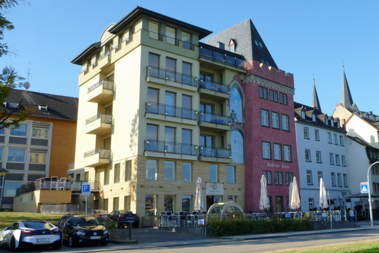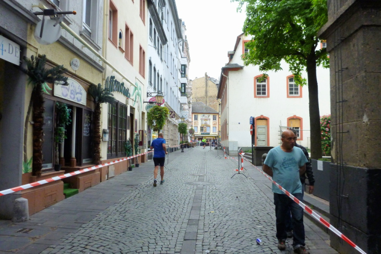 Nach Überquerung der historischen Brücke mit Blick auf das Koblenzer Moselufer steht der nächste VP exakt vor dem Koblenzer, hmmm, wie soll ich sagen? Gemischtgeschlechtliche Begegnungsstätte vielleicht? Links liegt wieder die Burg, deren Erbauung die Kurfürsten zur Grundvoraussetzung ihrer Genehmigung zum Bau der mittelalterlichen Stadtmauer machten. Denn im Zweifelsfall vor der eigenen Stadt ausgesperrt zu stehen, wäre für den hohen Herrn doof gewesen. Zentrale Altstadt bieten wieder Münzstraße und -platz sowie die Löhrstraße als Haupteinkaufsstraße, auch sie ist Fußgängerzone. Die Vier Türme, Erker vierer gegenüberliegender historischer Gebäude, sind jedes Mal wieder ein Hingucker. Wer erinnert sich noch an die kleine Lebensmittelkette dieses Namens?