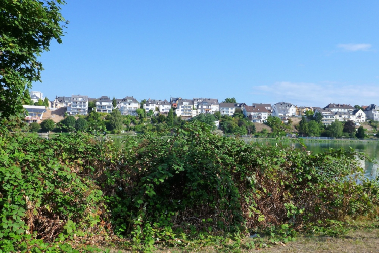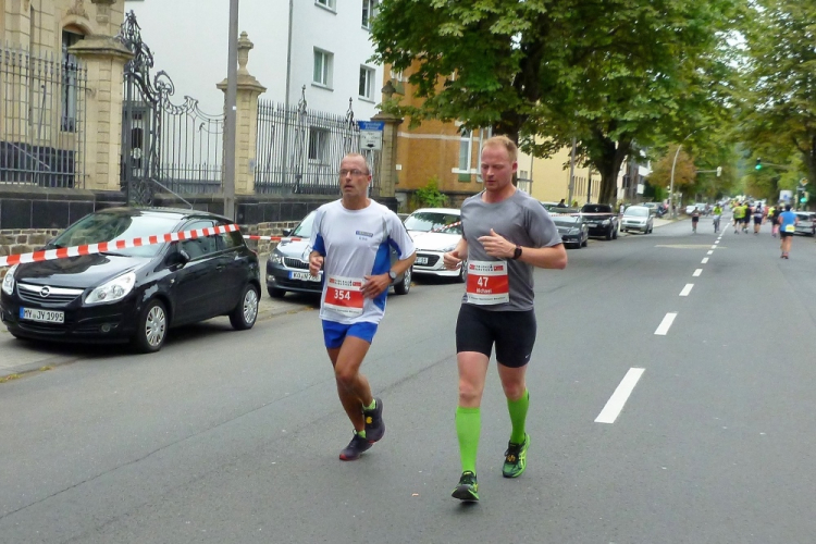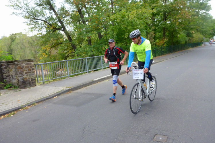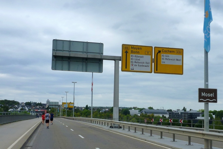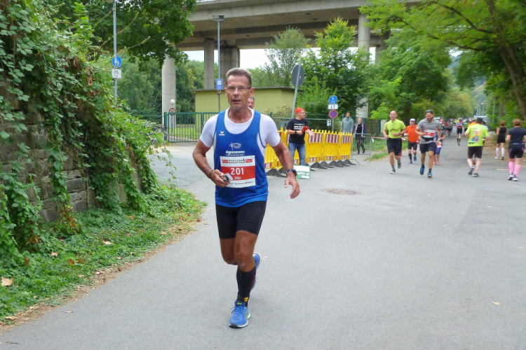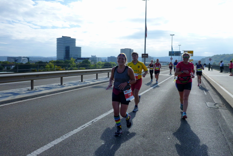Dahinter bzw. davor ist die Mosel zum Stausee aufgestaut und bildet ein Wassersportparadies. Wohl dem, der hier eines der ufernahen schönen Häuser sein eigen nennen kann. Völlig platt bin ich, meinen Freund Peter auf der Bank sitzen zu sehen. Die Folgen eines simplen Mückenstichs haben ihn vor fast zwei Wochen in die Klinik gebracht, aber die Entlassung ist glücklicherweise absehbar. Km 10 ist vorüber, ebenso meine erste Laufstunde. Wir befinden uns jetzt an der Südbrücke (Kurt-Schumacher-Brücke), welche die Bürostadt mit Metternich verbindet, und nehmen hier die einzigen (eigentlich nicht) nennenswerten Höhenmeter. Auf beiden Runden zusammen habe ich deren 137 gemessen. Hier überhole ich René Wallesch, der mit seinen rund 1.250 gelaufenen Marathons auf Platz sechs in den Top Ten des 100 Marathon-Clubs steht.