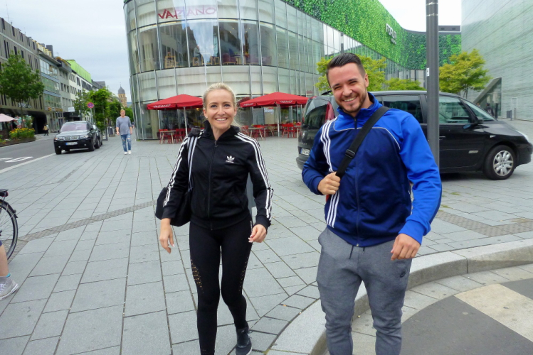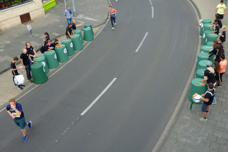 Mit einigen Asbacher Laufmäusen, darunter Andrea (Hartmut hat erkältungsbedingt zurückgezogen, ist aber mehrfach als Fan an der Strecke), geht’s wieder ins alte Lützel. Lachen muss ich, als Julia ihrem Begleiter erzählt, sie sei vor Köln noch in Waldbreitbach als Einzelläuferin beim StaffelMarathon unterwegs. Lachen muss sie, als ich mich als Veranstalter zu erkennen gebe. Bis bald, Julia, vielleicht nutzen ja noch ein paar weitere Läufer mit Dir die Gelegenheit! Vorbei an einer Percussionband auf Regenfässern geht es aufwärts auf die Balduinbrücke, die wir ja schon von der Gegenseite gesehen haben. Brandneu ist das großformatige Frauenbildnis an einer Hausseite zur Brücke hin, welche die vermutlich älteste gemalte Koblenzer Werbung („Willst Du Deine Möbel schonen, ziehe aus und ein mit Bohnen“) abgelöst hat. Der Bendorfer Hendrik Beikirch hat es zugunsten des Koblenzer Frauennotrufs geschaffen.
