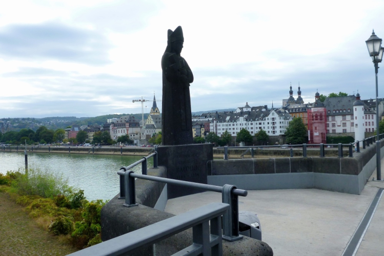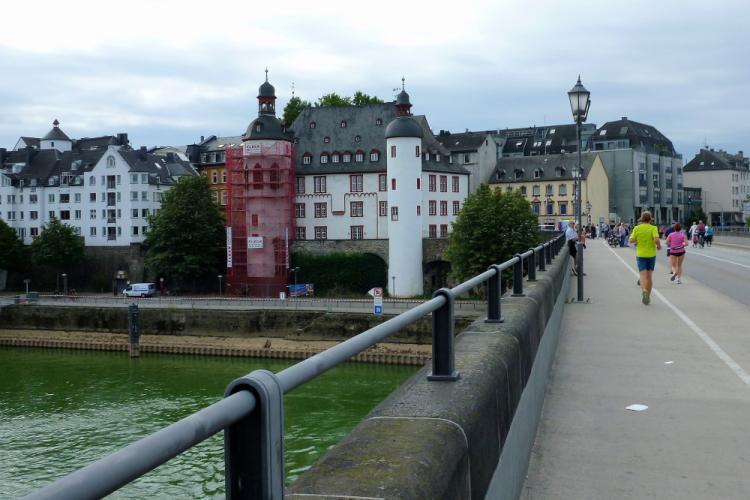 Ich liebe meine Geburtsstadt, falls es jemandem noch nicht aufgefallen sein sollte, und der weitere Streckenverlauf zeigt auch, warum. Viele geschichtliche Details habe ich übrigens im letztjährigen Laufbericht genannt, die ich hier nicht alle wiederholen kann und möchte, sonst werde ich nie fertig. Jetzt laufen wir über das Moselufer weiter und dürfen uns über einige attraktive Gebäude auf der linken und das Wasser auf der rechten Seite freuen. Wir erreichen die Balduinbrücke, die älteste nach einem Trierer Kurfürsten (Koblenz gehörte zum Kurfürstentum Trier) benannte Koblenzer Brücke. Hier bogen wir im letzten Jahr ab, um auf die andere Seite nach Lützel zu kommen. Nicht in diesem Jahr.