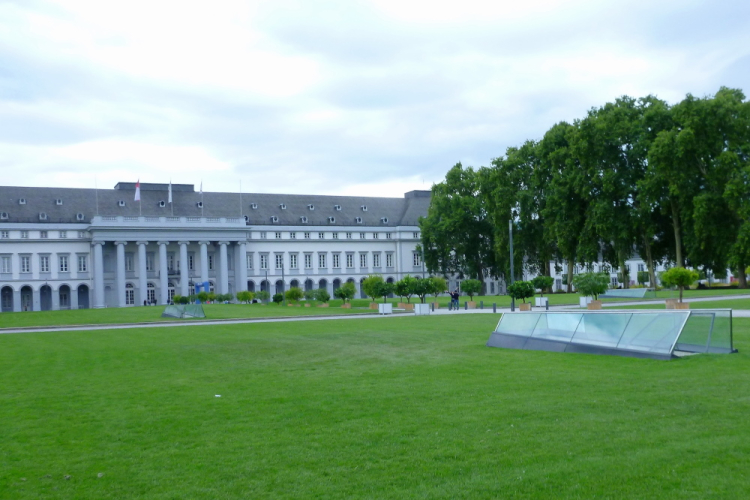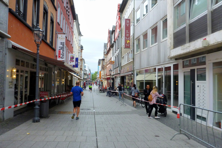 Um das Gebäude der heutigen Struktur- und Dienstleistungsdirektion Nord (vulgo Bezirksregierung) und den Gerichtsgebäuden erreichen wir den Deinhardplatz, der mit einem Ensemble mehrerer historischer Gebäude inkl. eines Obelisken zweifellos eine der Koblenzer Schokoladenseiten darstellt. Der Name kommt nicht von ungefähr: Hier nahm die Koblenzer Wein- und Sektherstellung ihren Anfang. Über die breite Pfuhlgasse (die tatsächlich ursprünglich schmale Gasse hatte man nach dem Krieg stark verbreitert) biegen wir in die zentrale Altstadt ein. Seit vielen Jahren ist der Entenpfuhl als Fußgängerzone beliebte Einkaufsstraße. Die Firmungsstraße führt an meinem Lieblingsplatz, dem Jesuitenplatz, mit ehem. Kolleg, Kirche und weiteren Glanzlichtern vorbei über den Görresplatz mit Historiensäule zum Rhein. Zahlreiche Cafés haben geöffnet, die draußen Sitzenden spenden manchmal sogar Beifall.