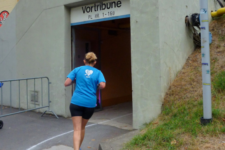 Vor dem Stadion begegnet mir der Augsburger Udo, den ich in schöner Regelmäßigkeit mindestens einmal im Jahr irgendwo treffe. Exakt an km 20 (2:01 Std.) passieren mich die 4 Stunden-Zugläufer, von denen mich Dirk lautstark begrüßt. Durch ein kleines Seitentor geht es ins Stadion hinein und auf die Bahn. Am Zielbogen vorbei drehen wir Marathoner noch eine weitere Dreiviertelrunde auf der Tartanbahn, bevor man uns das gleiche Vergnügen ein zweites Mal bietet und aus dem Stadion entlässt.