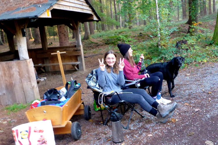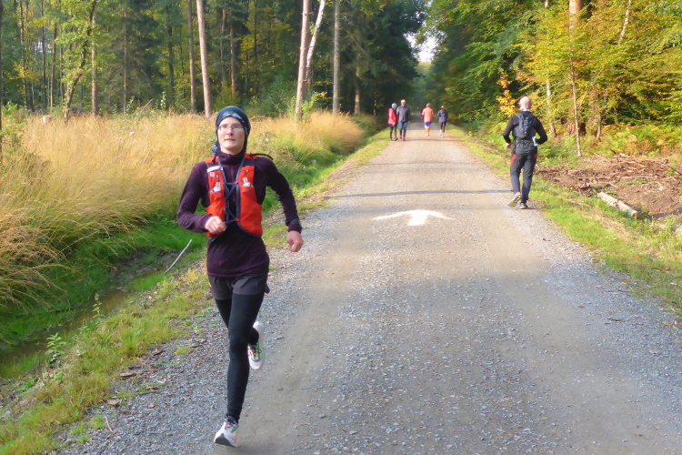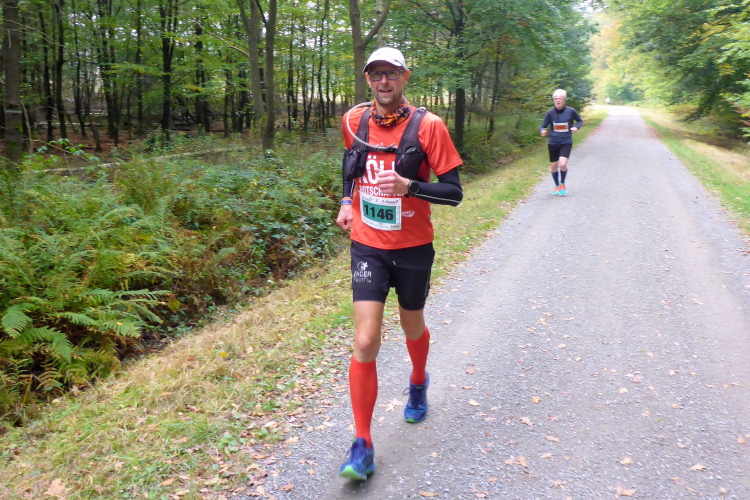 Wir verlassen das Albertus-Magnus-Gymnasium und laufen den ersten Kilometer durch Bensberg, um dann im Königsforst zu verschwinden. Die Strecke unterquert die Autobahn und wir legen ein Stückchen auf einer Waldautobahn zurück. Jetzt geht es rund 2,5 km an einer Straße entlang, der breite Radweg ist geteert, es lässt sich gut laufen. Nach 4,5 km sehen wir Forsbach vor uns, werden aber von freundlichen Helfern kurz vor der Zivilisation wieder in den Wald geleitet. Die kommenden 15 km können wir uns im Wald austoben, schließlich haben wir den Königsforst gebucht.