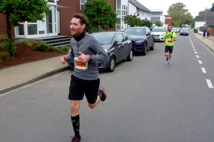 Die zweite Runde läuft gut, aber etwas langsamer. Die Strecke ist, reduziert um die Schnellen und die Halbmarathonis, jetzt überschaubarer. Die Verpflegung am zentralen VP ist mit Cola & Riegel ergänzt. Jochen Baumhof und sein TV Refrath wissen, was Läufer brauchen.