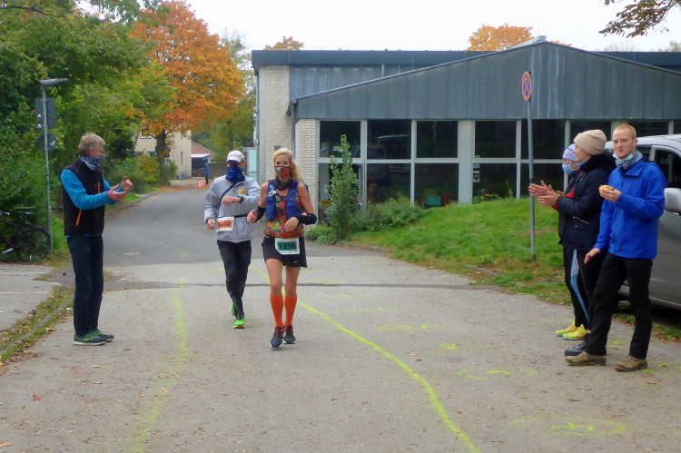 Der Zieleinlauf ist fast lautlos, alle halten sich an die Auflagen, ziehen die Masken hoch und verlassen schnell den Zielbereich, um Platz zu machen. Jeder nimmt sich seine Medaille, im Pausenhof des Gymnasiums gibt’s Äpfel und Bananen, Wasser, Iso und das versprochene Finisher Bier. Nach 42,2 km ist das wie immer ein besonderer Genuss. Um Begegnungen zu vermeiden, verlassen wir das Schulgelände auf der anderen Seite und treten glücklich und bis auf blöde 12 Sekunden zufrieden die Heimreise an.